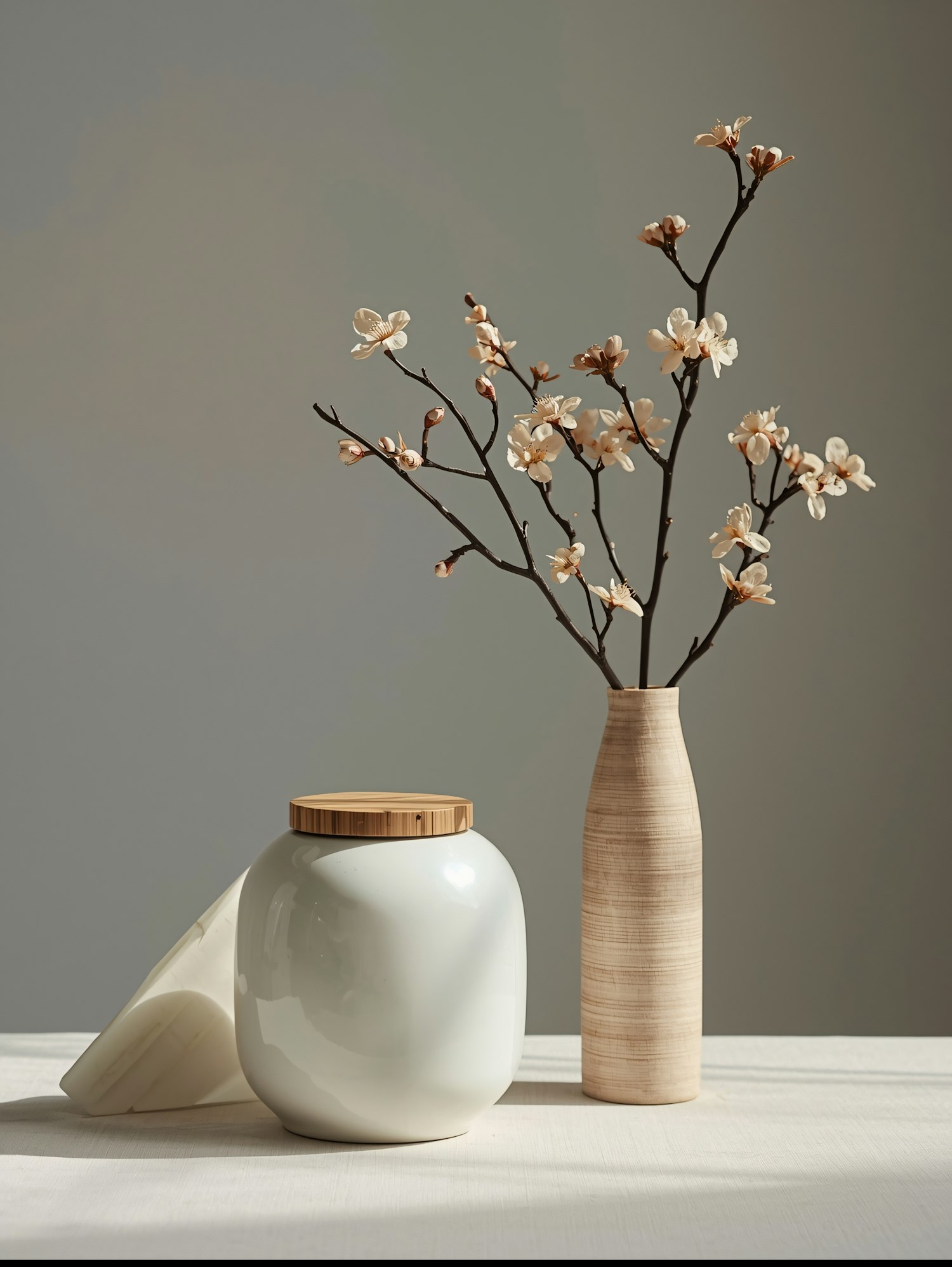Minimalist decor with a white jar, wooden vase, and delicate blossoms on a neutral background. Perfect for modern interior inspiration.