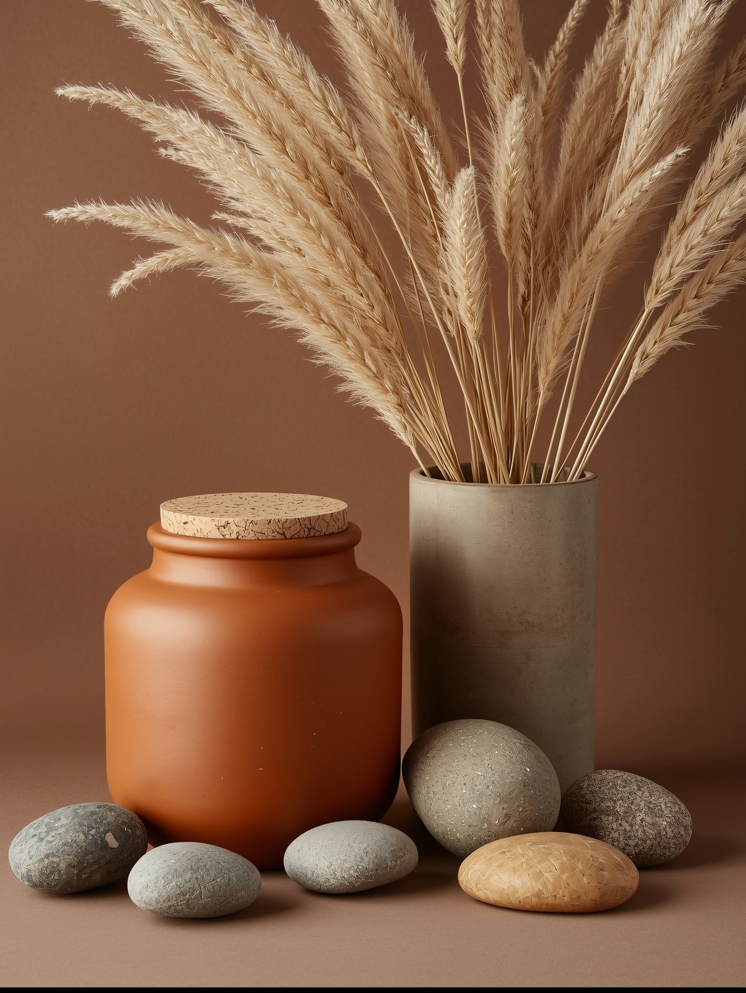 Minimalist still life with a terracotta jar, pampas grass in a beige vase, and smooth stones on a warm brown background.