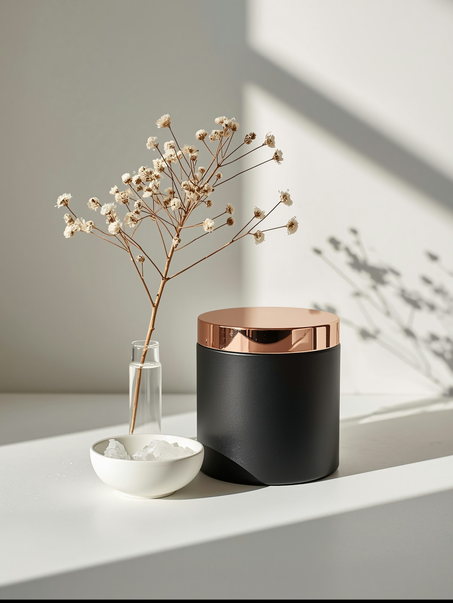 Minimalist decor with a black container, copper lid, white bowl, and dried flowers in soft natural light. Perfect for modern aesthetics.