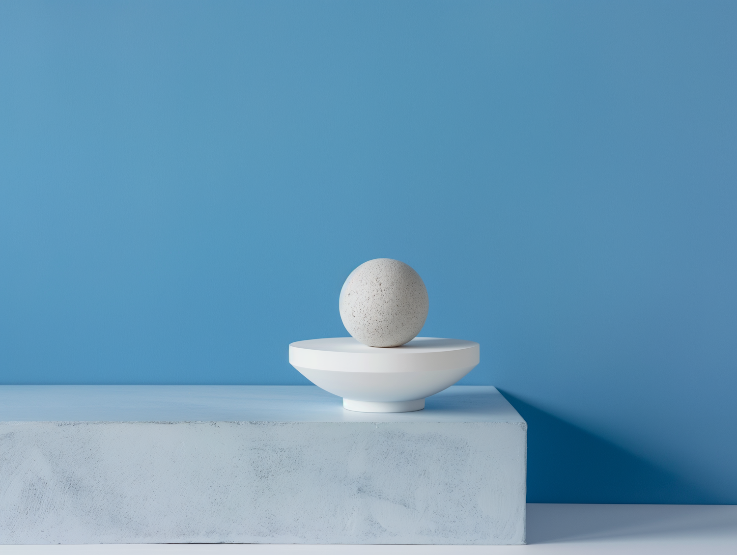 Minimalist design with a concrete sphere on a white platform against a vibrant blue background. Clean, modern aesthetic.