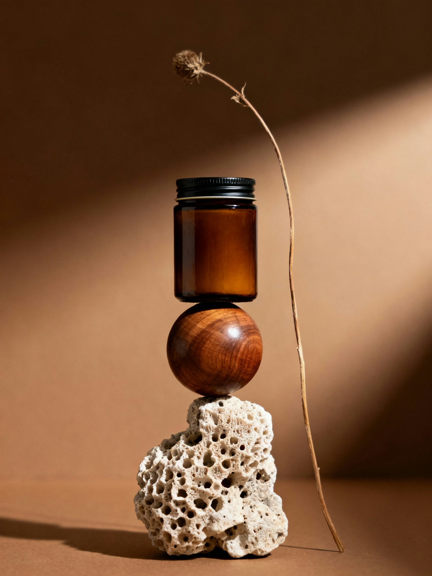 A balanced arrangement of an amber jar, wooden sphere, and textured stone with a dried plant, set against a warm brown background.