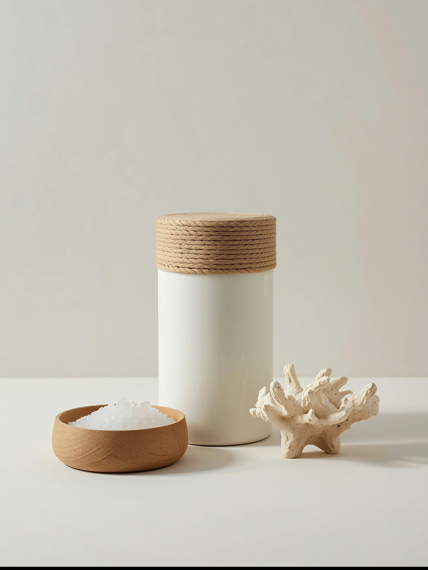 Minimalist decor with a white jar, wooden bowl of salt, and coral on a neutral background. Perfect for spa or natural-themed settings.