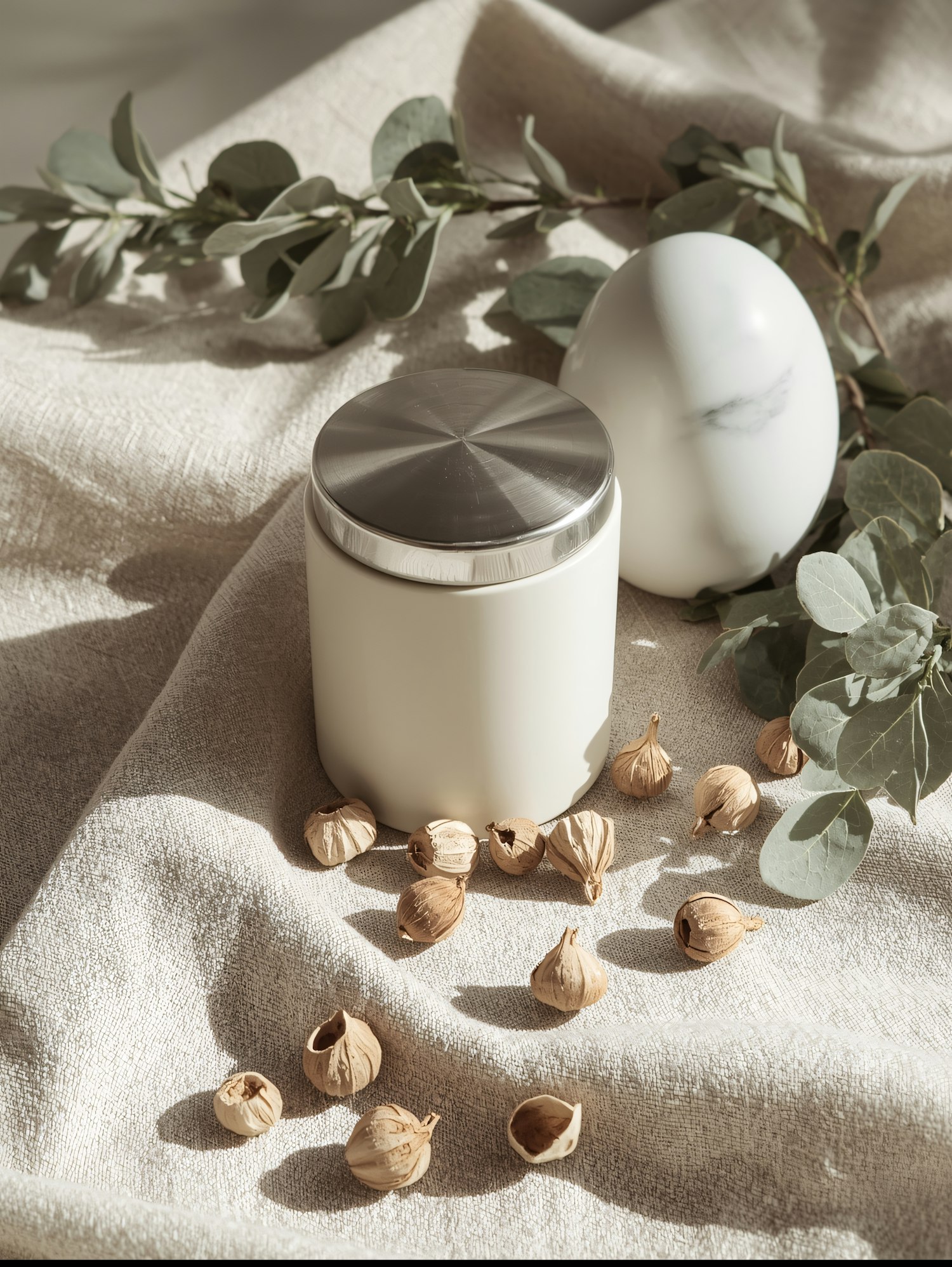 Minimalist setup with a white container, marble egg, dried pods, and eucalyptus on beige fabric, perfect for natural decor inspiration.