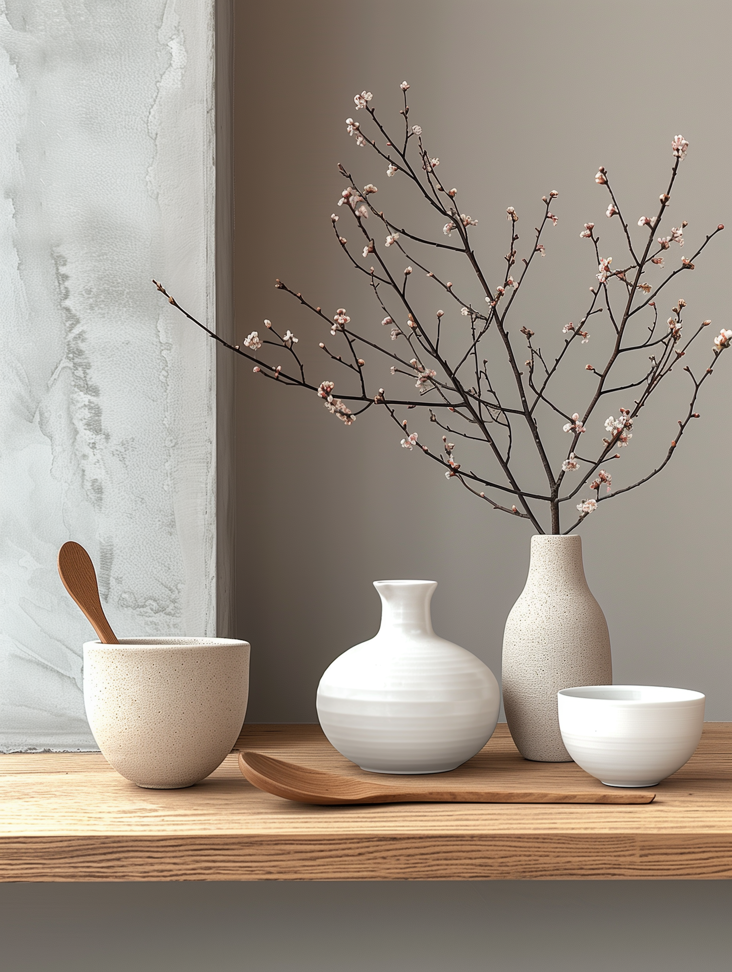 Minimalist ceramic and wooden decor with vases, a cup, and blossoming branches on a wooden shelf.