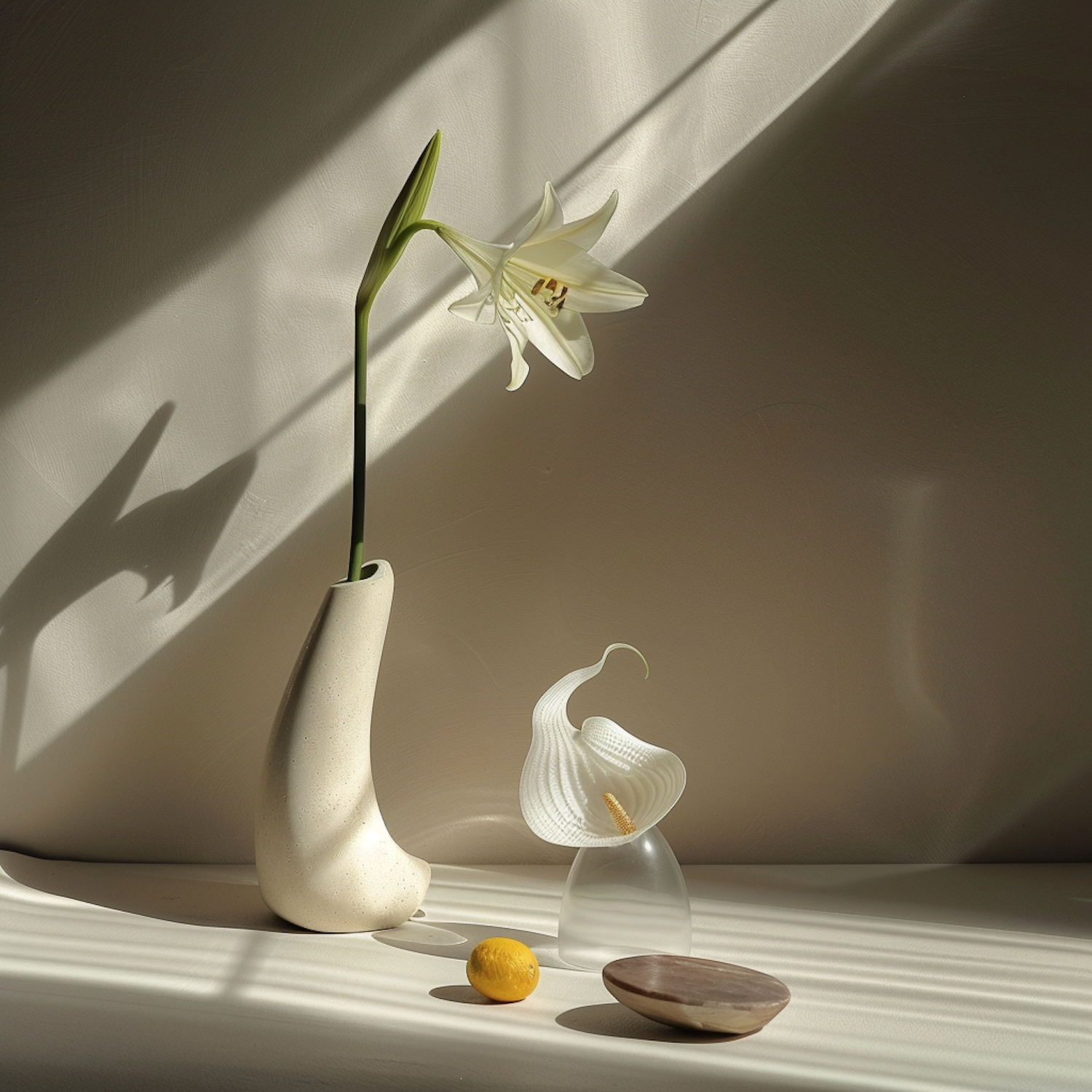 Minimalist still life with a white lily in a curved vase, a yellow fruit, and a translucent flower in soft natural light.