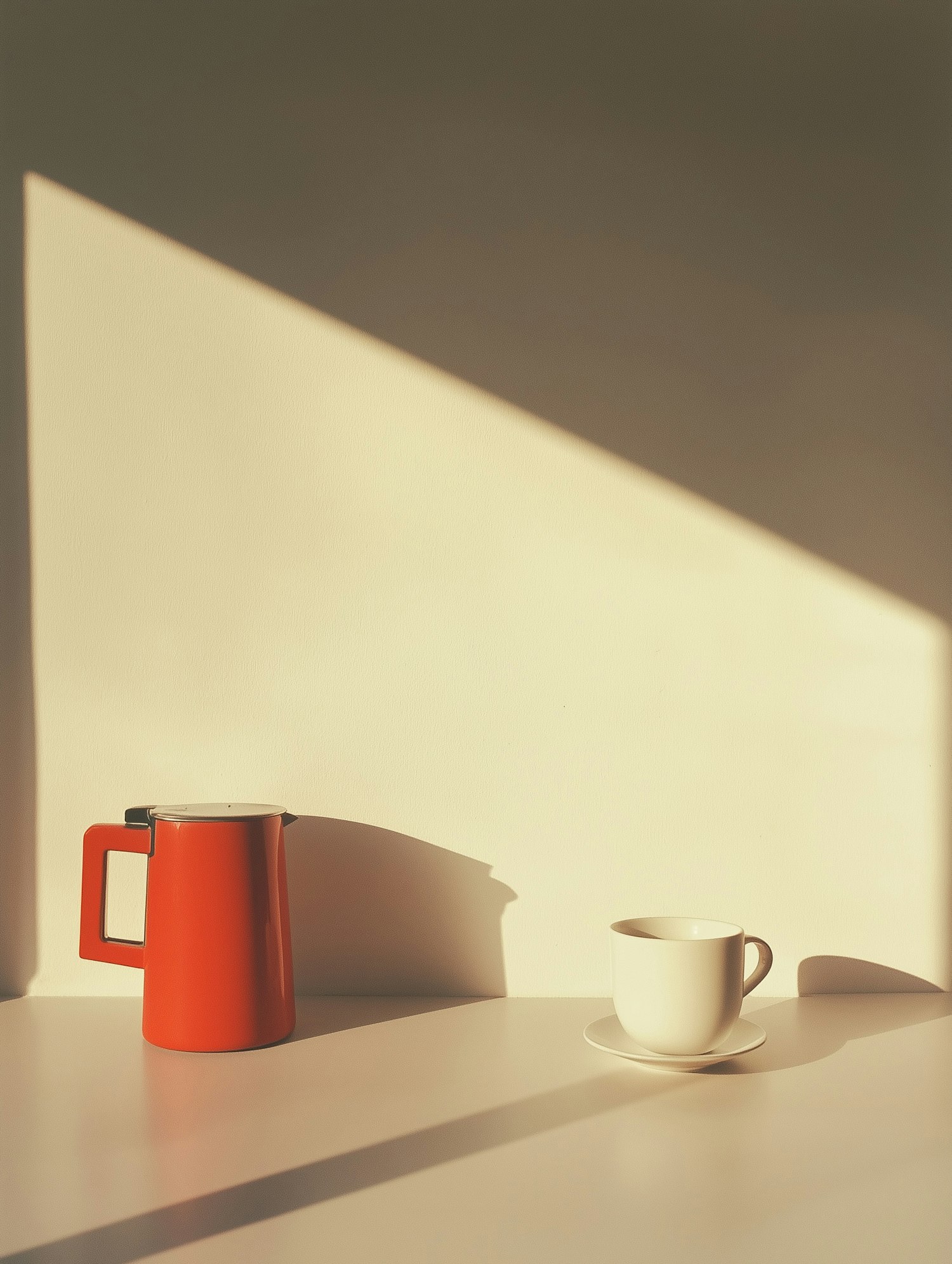 Minimalist scene with a red kettle and white cup casting shadows in warm sunlight on a light surface.