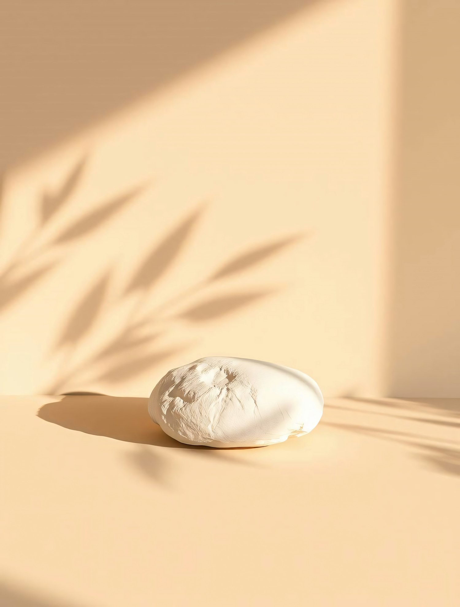 Minimalist beige scene with a textured white object, soft lighting, and leaf shadows creating a serene and natural vibe.
