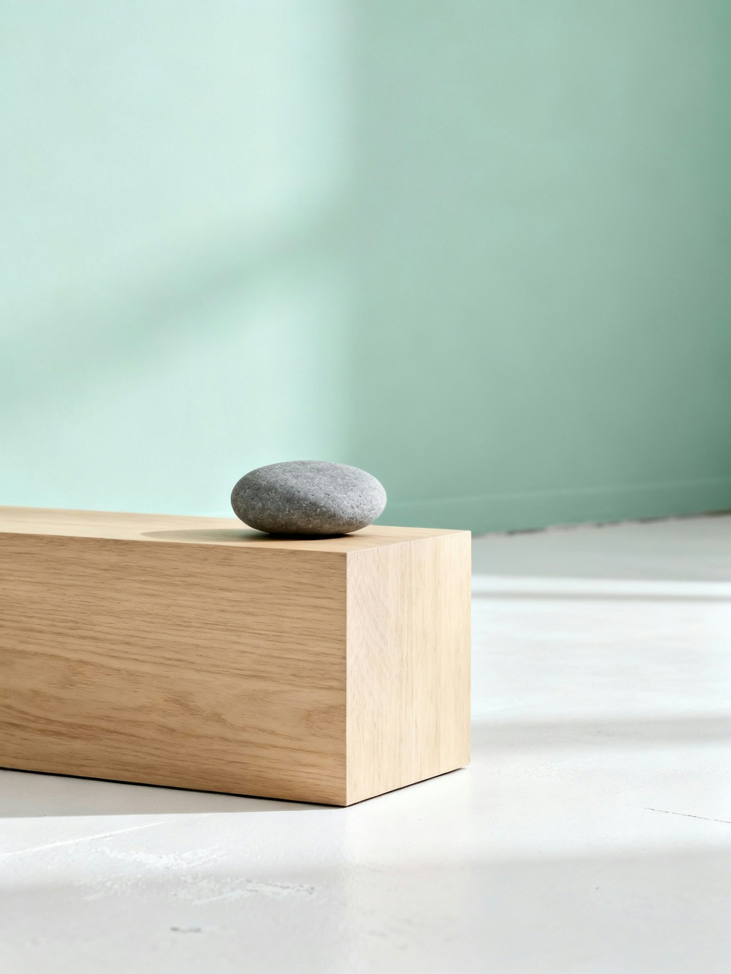 A minimalist setup with a gray stone on a wooden block against a mint green wall, showcasing natural textures and soft lighting.