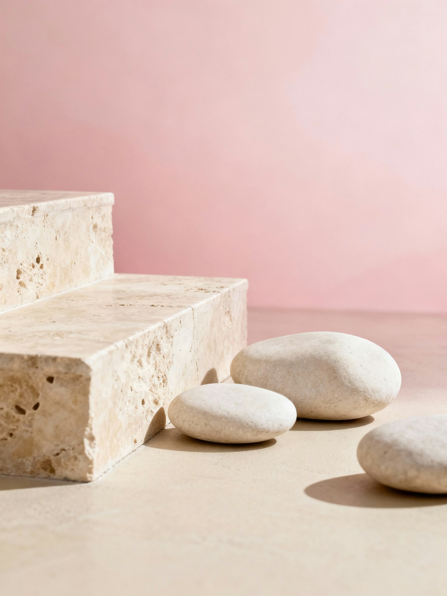 Minimalist arrangement of smooth white stones on a beige surface with a textured stone step and a soft pink gradient background.