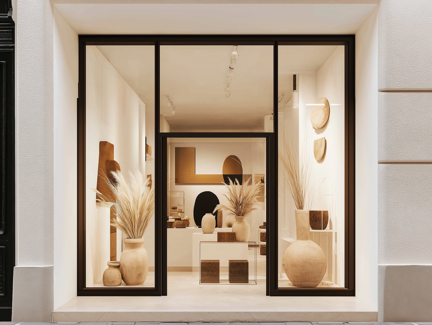 Minimalist storefront with earthy vases and pampas grass, showcasing a natural, modern design with neutral tones and geometric decor.