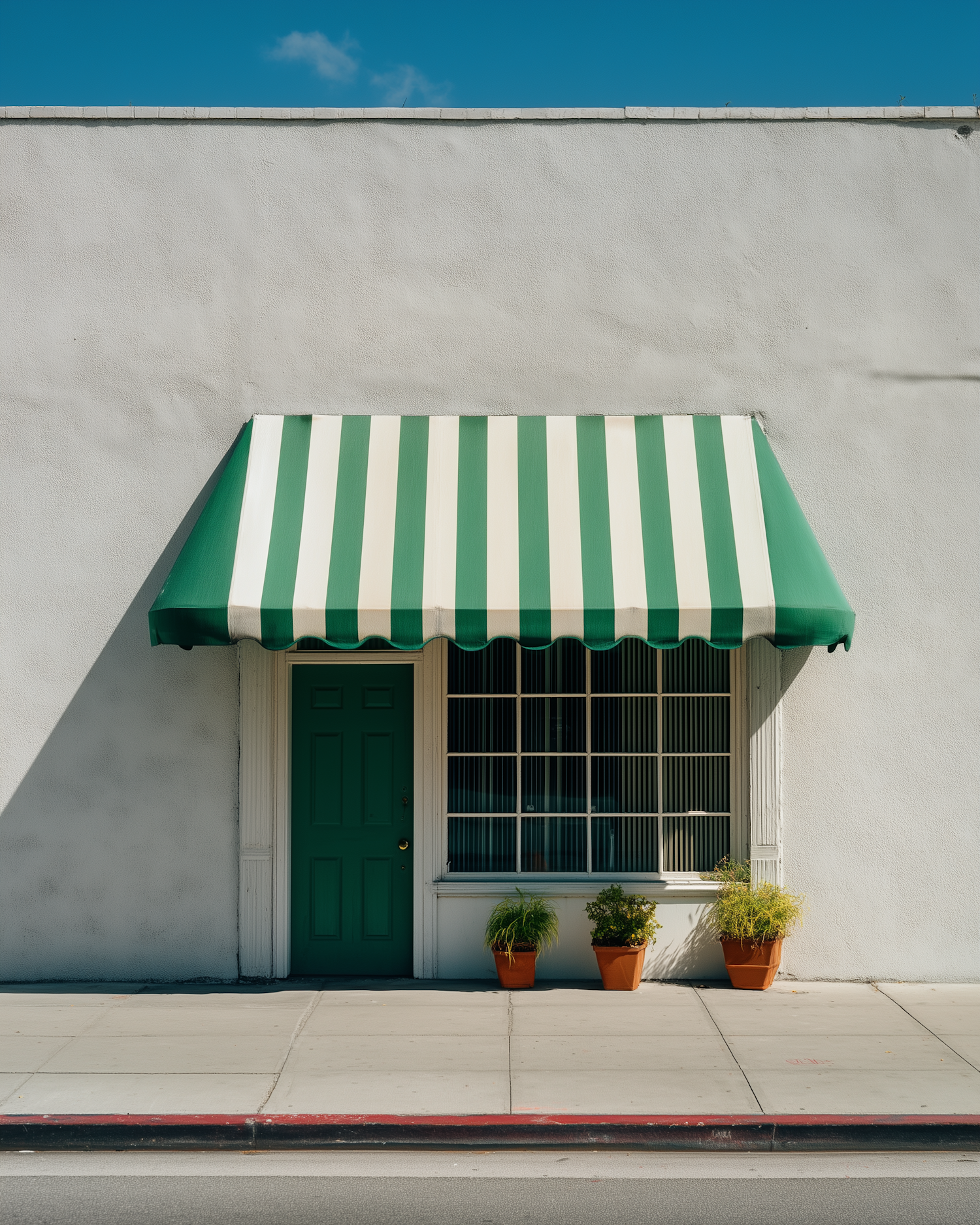 Charming storefront with green-and-white striped awning, green door, and potted plants on a sunny day. Perfect for urban design inspiration.