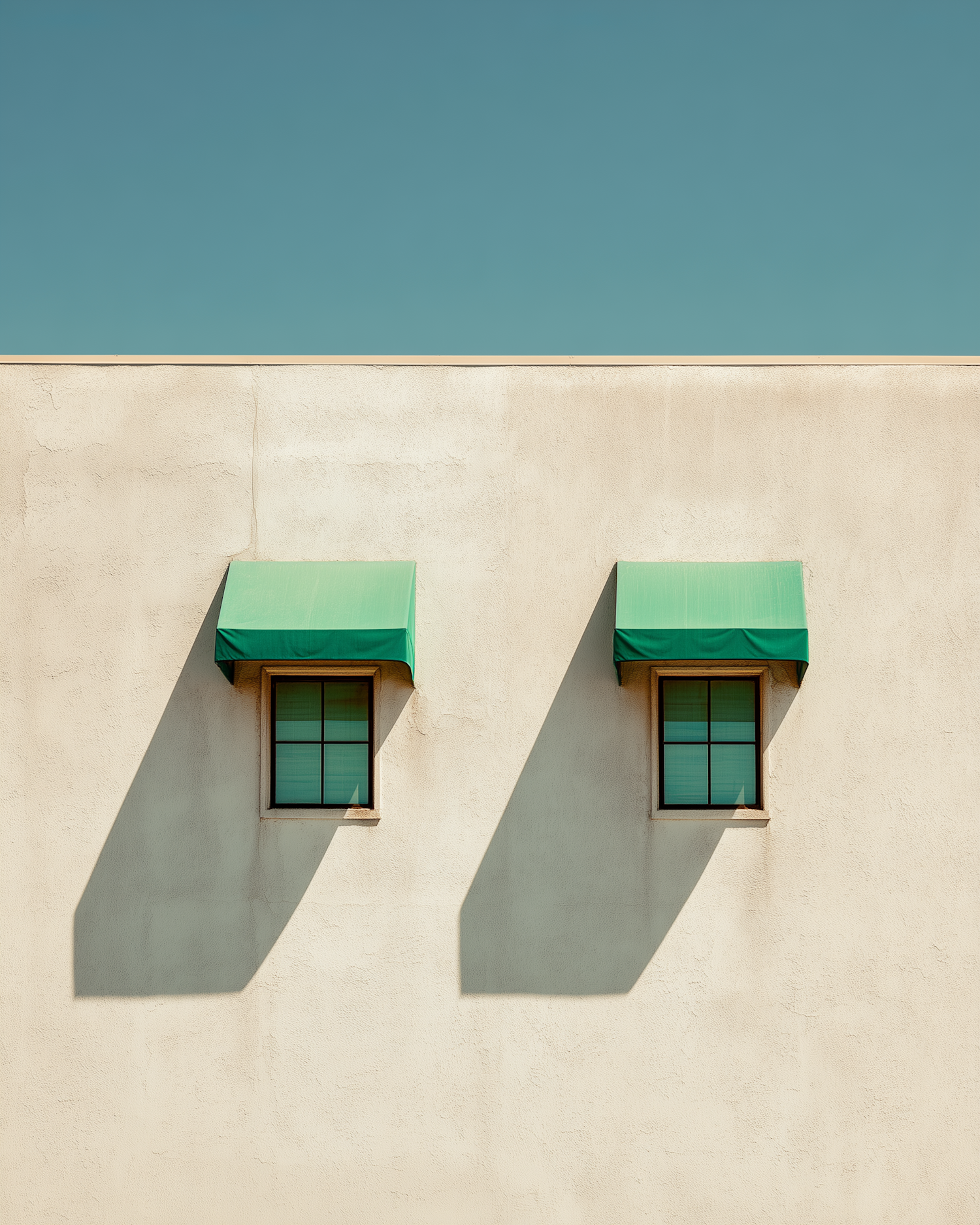 Minimalist beige stucco wall with two green-awning windows casting sharp shadows under a clear blue sky. Clean and symmetrical design.