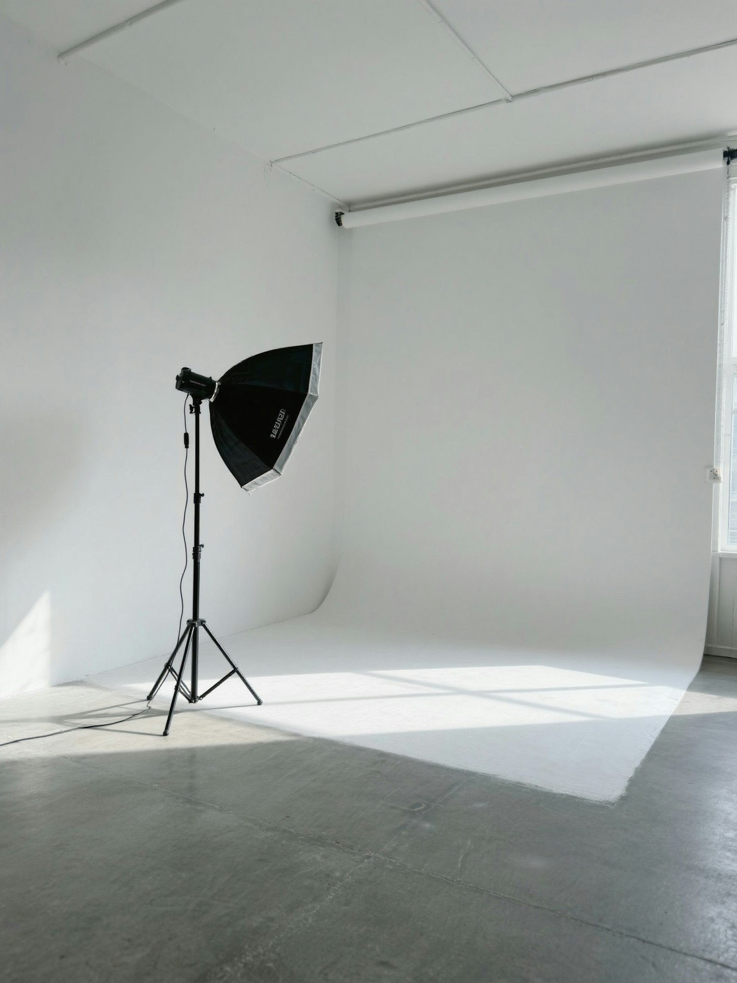 Minimalist photography studio with a white backdrop, softbox light, and natural light streaming through a window.