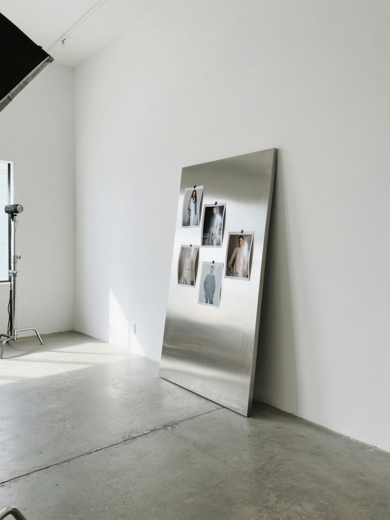 A minimal photography studio space, soft ambient daylight, neutral colors, clean concrete floor, white wall, high-definition editorial photo, modern and professional mood, a large brushed metal panel leaning against the wall with fashion reference photos pinned on top