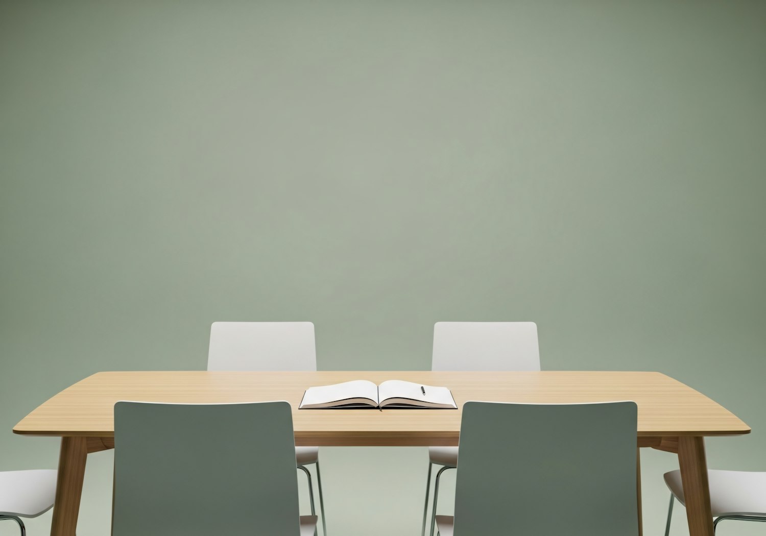 A minimalist setup with a wooden table, modern chairs, and an open book with a pen, set against a soft green background.