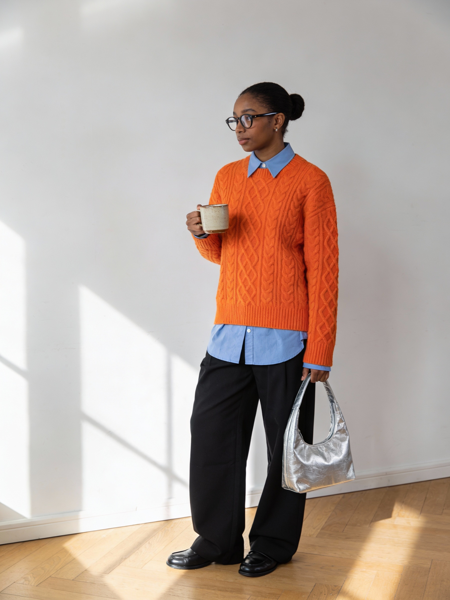 A fashion-forward black individual stands indoors against a plain white wall and light wooden floor, evoking Scandinavian minimalism. They wear a bright orange cable-knit sweater layered over a light blue button-up shirt, paired with loose-fitting black trousers and black shoes. Their hair is styled in a neat bun, and they wear glasses. One hand holds a ceramic cup, the other a metallic silver handbag. The lighting is soft and natural, casting gentle shadows that highlight the textures of the knitwear and the clean lines of the outfit. The composition is editorial and cozy, with a bold color contrast that feels modern and seasonally resonant — perfect for autumn or winter fashion storytelling