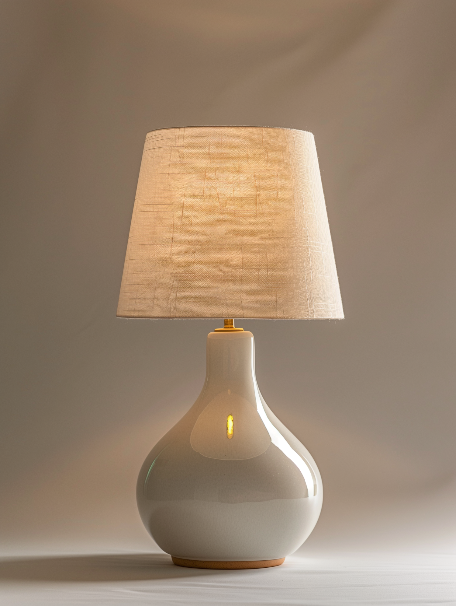 Minimalist table lamp with a glossy ceramic base and textured beige lampshade, perfect for modern interiors. Warm and cozy lighting.