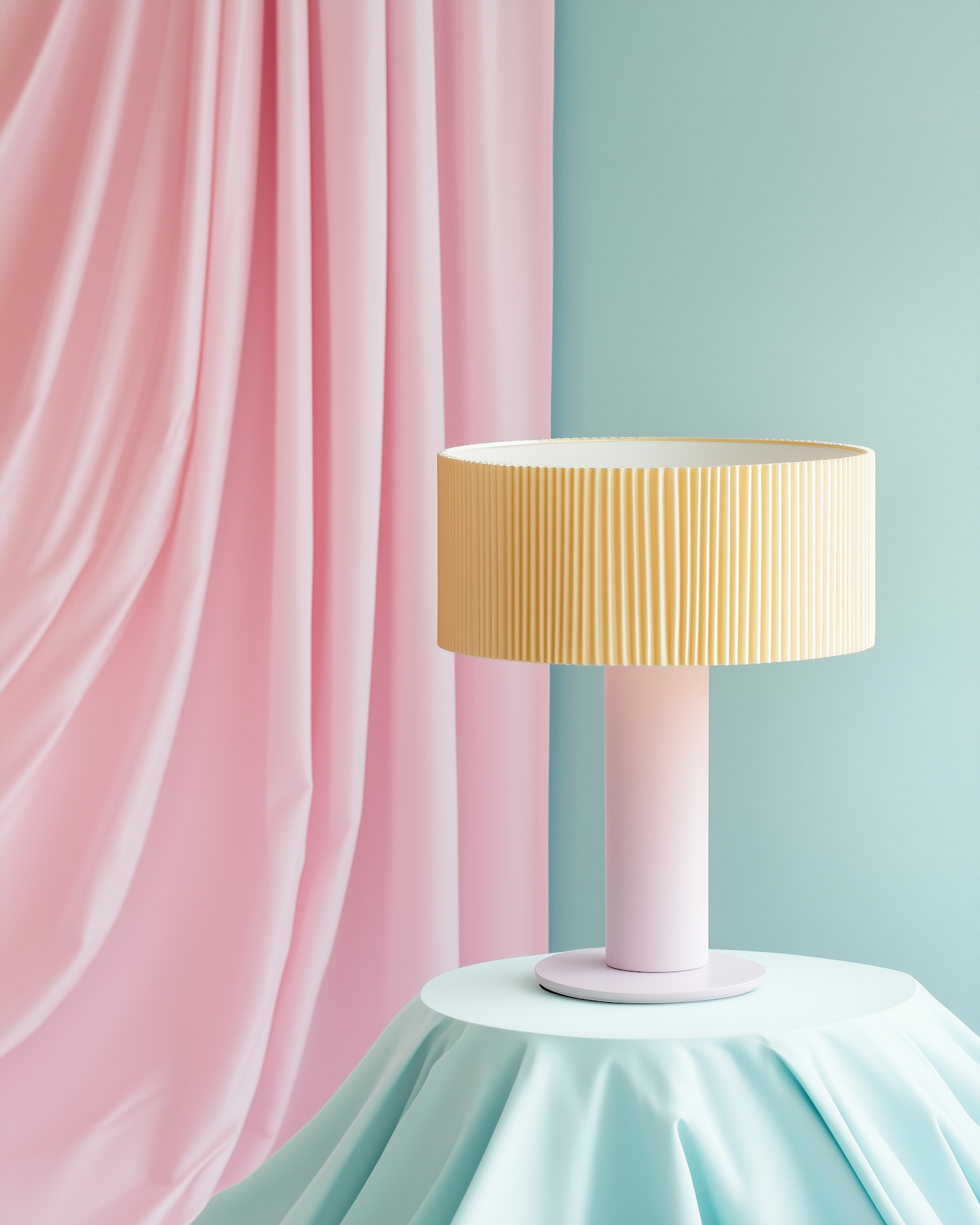 Minimalist table lamp with a yellow pleated shade on a pastel blue table, set against pink drapes and a pastel blue wall.
