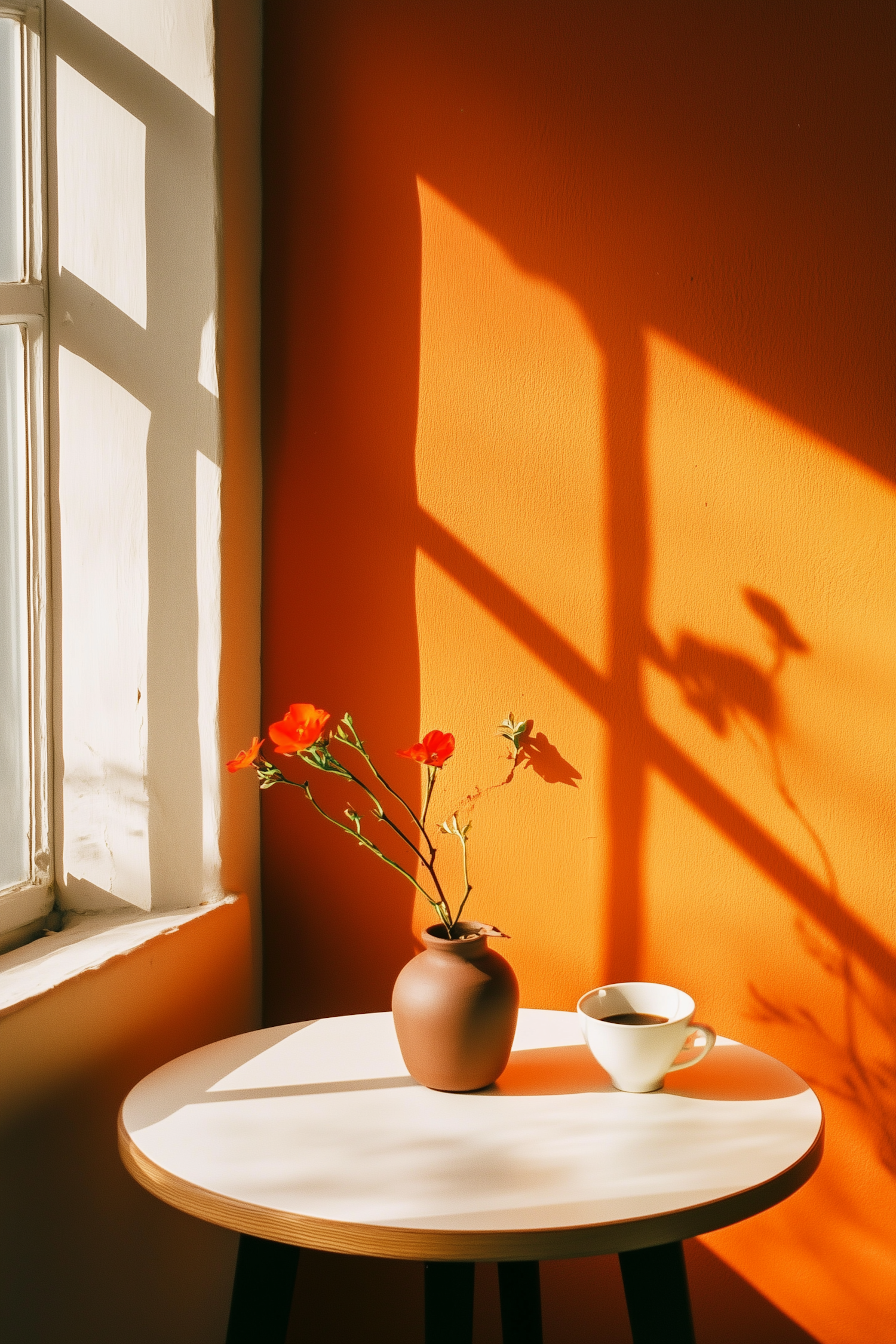 Minimalist table with a vase of red flowers and coffee cup, bathed in warm sunlight against an orange wall with geometric shadows.