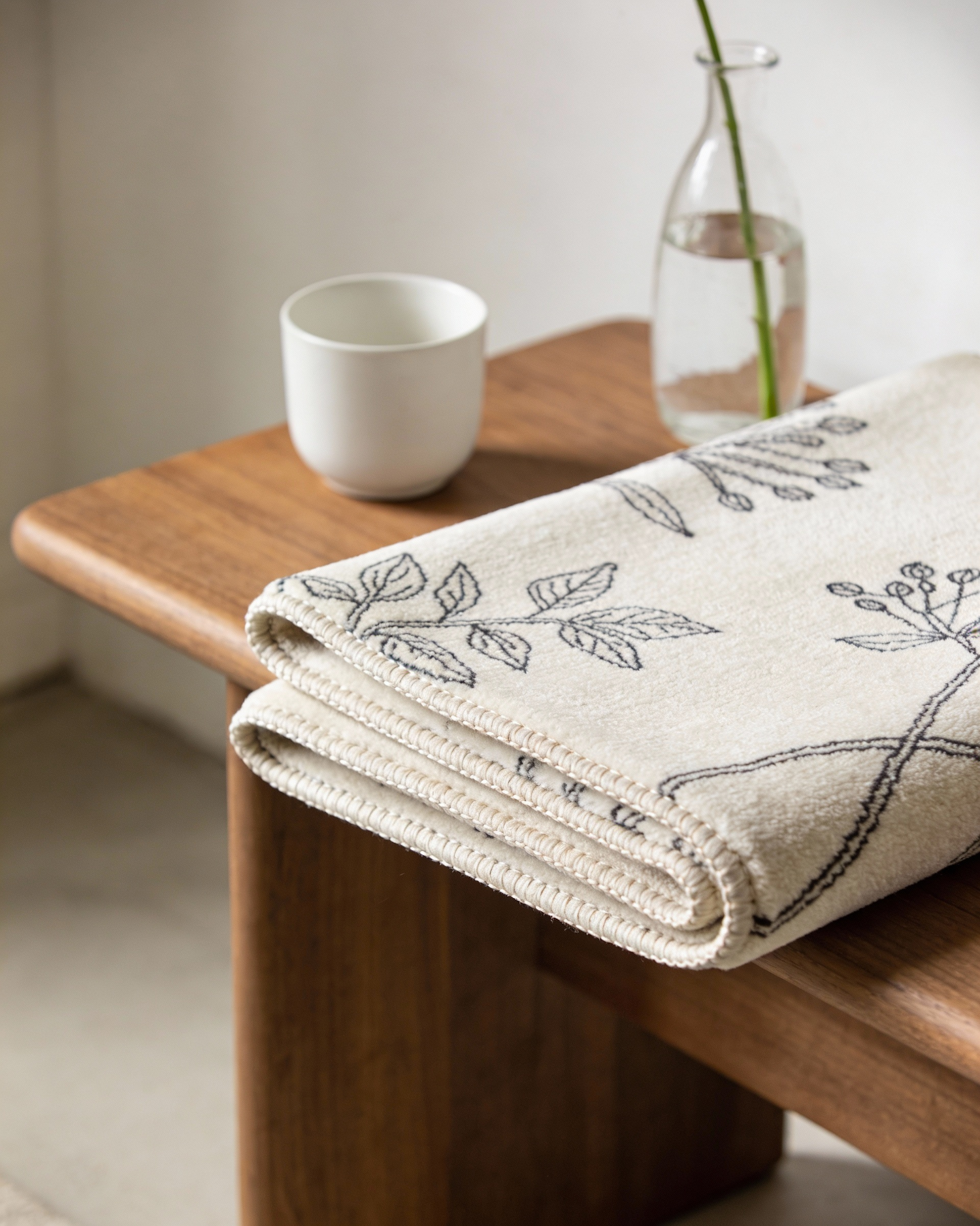 An ivory rug featuring delicate charcoal botanical line drawings rests neatly on a low oak side table. Instead of fringe, the edges are finished with a subtle whipstitch. A ceramic cup and a single stem in a glass vase sit beside it, creating a quiet, minimalist vignette.