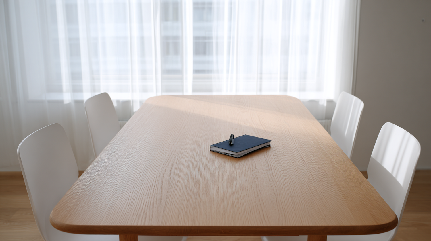 A minimalist wooden table with a notebook and pen, surrounded by white chairs, set against softly lit sheer curtains.