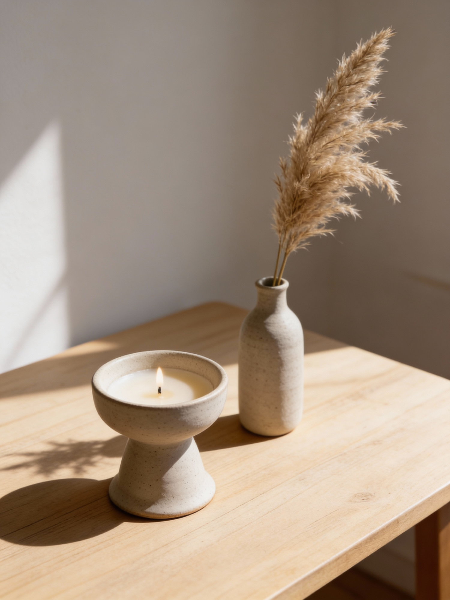 A serene setup with a lit candle in a ceramic holder and a vase with pampas grass on a wooden table, bathed in soft natural light.