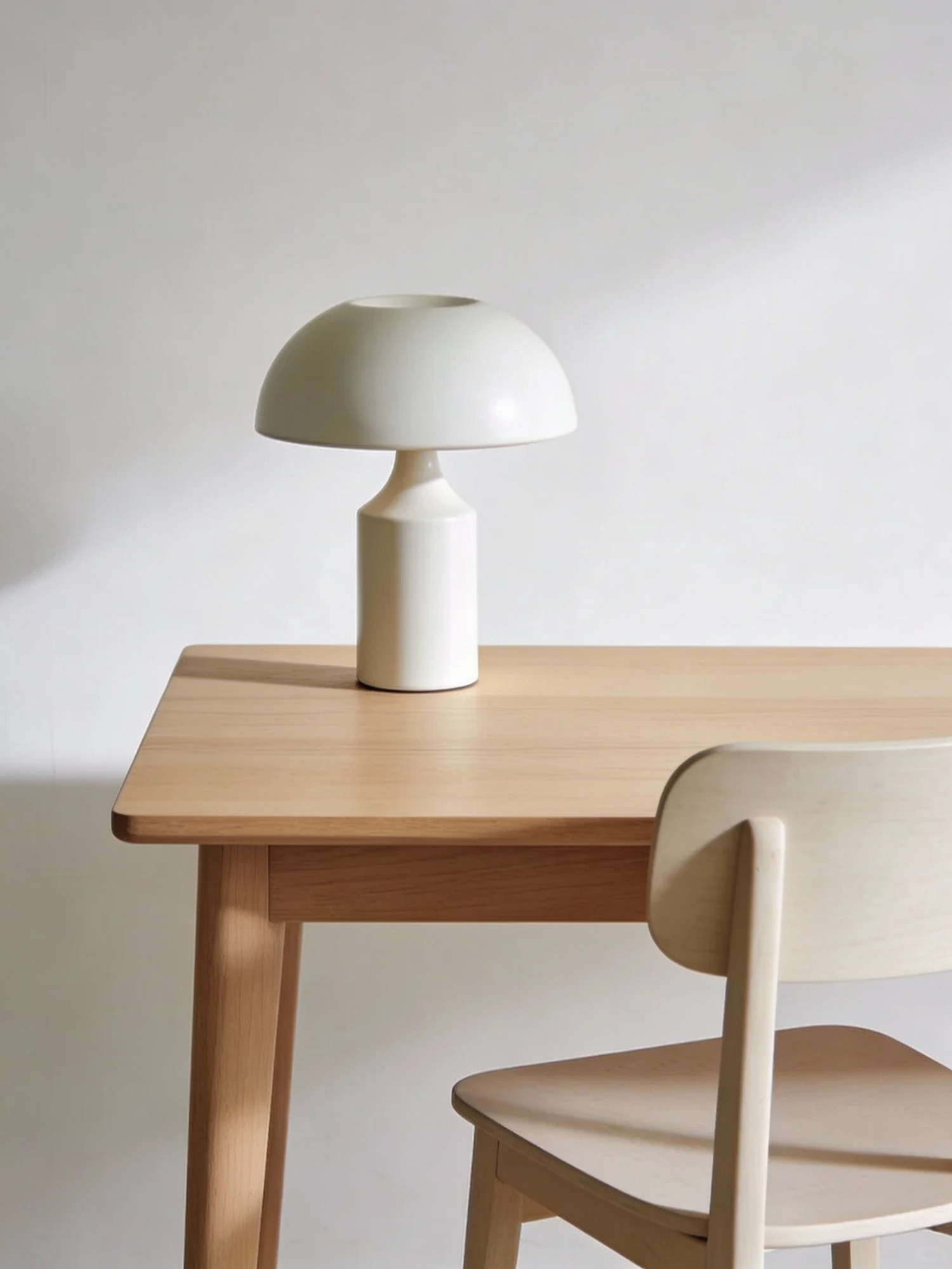 Minimalist wooden table and chair with a modern white ceramic lamp, perfect for a serene and stylish interior setup.