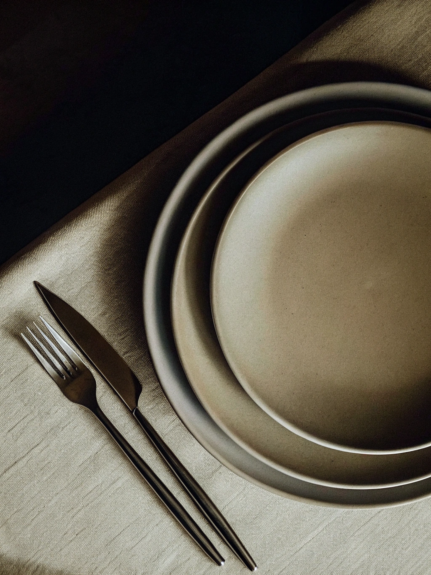 Minimalist table setting with neutral ceramic plates, stainless steel cutlery, and a beige tablecloth in soft, moody lighting.