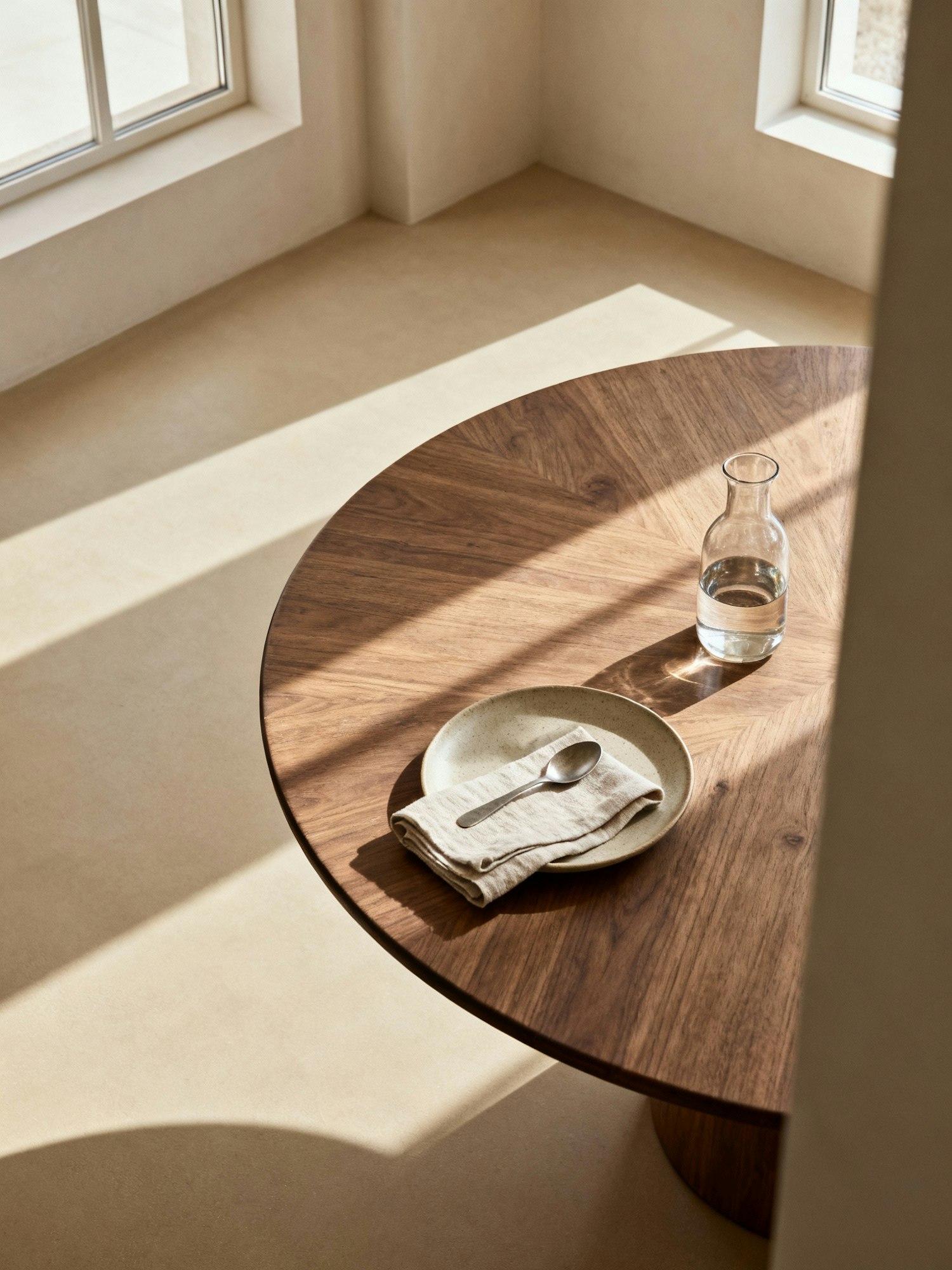 A minimalist table setting with a wooden table, ceramic plate, napkin, spoon, and glass carafe, illuminated by soft natural light.