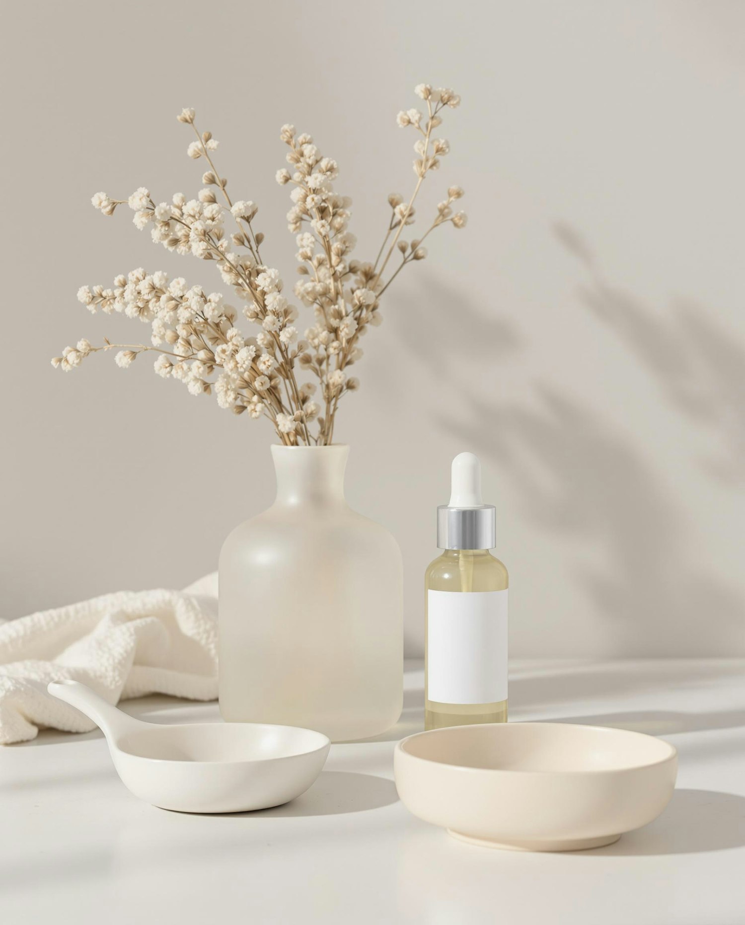 A soft, minimalist still life captured in cool diffused daylight, featuring matte surfaces, creamy textures and pale neutral tones on light grey or stone backgrounds. All labels are blank. Shelf scene with a blank-labeled serum bottle, a ceramic dish and dried foliage in a frosted glass vase.