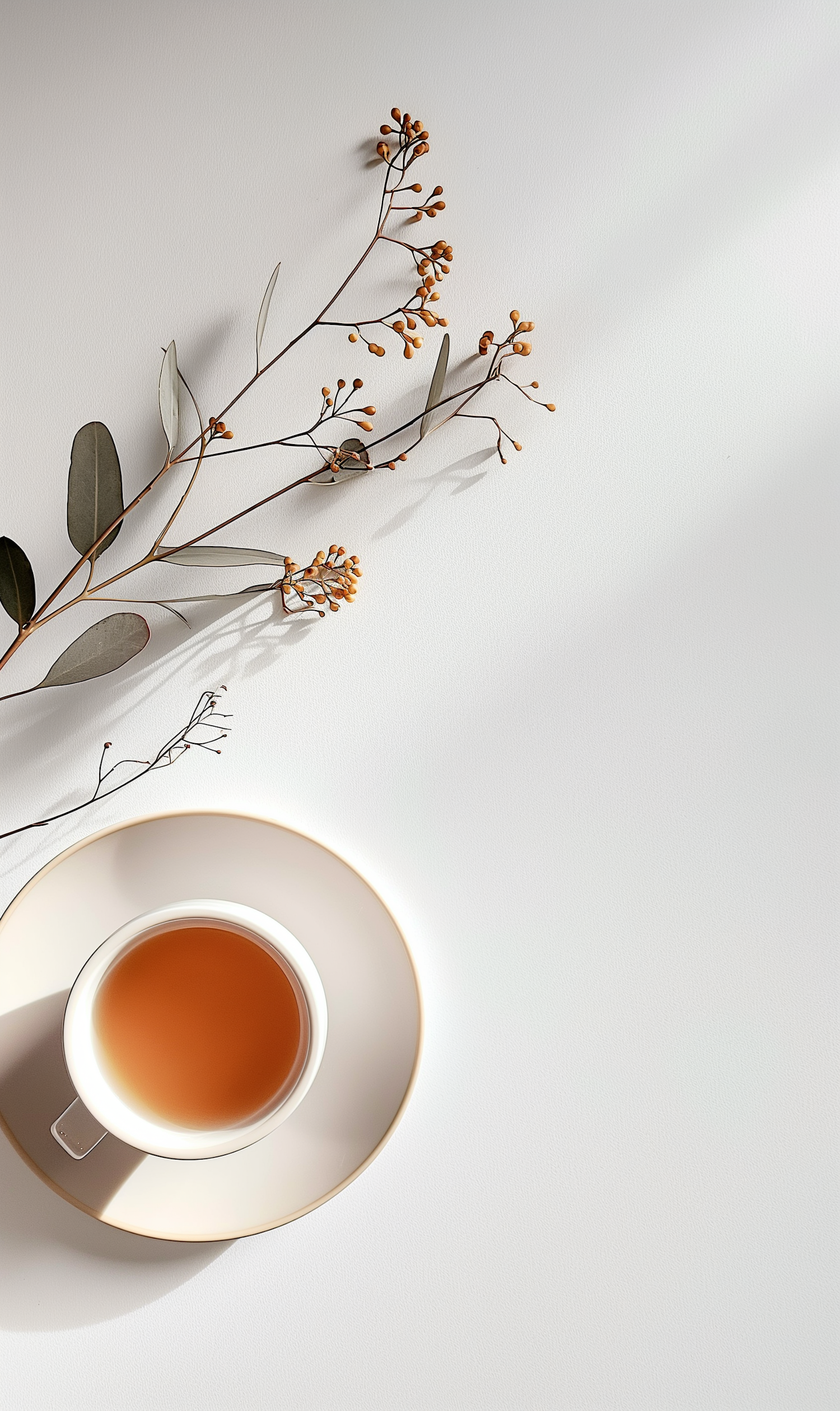 Minimalist scene with a white cup of tea and dried branches on a white background, creating a serene and elegant composition.