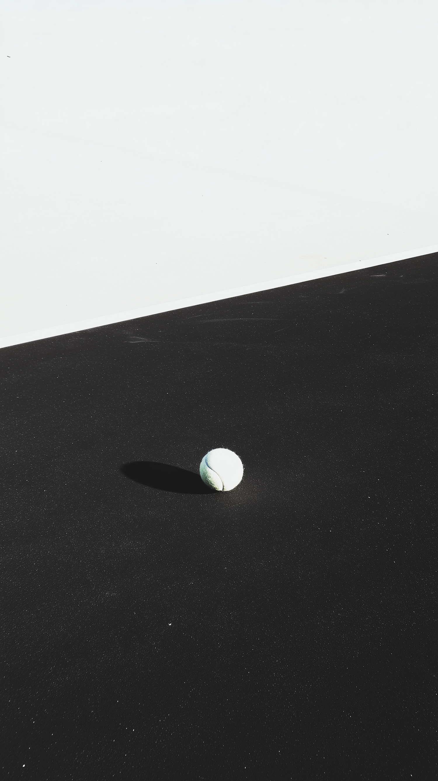 Minimalist photo of a tennis ball on a black surface with a diagonal white line, creating a striking contrast and clean composition.