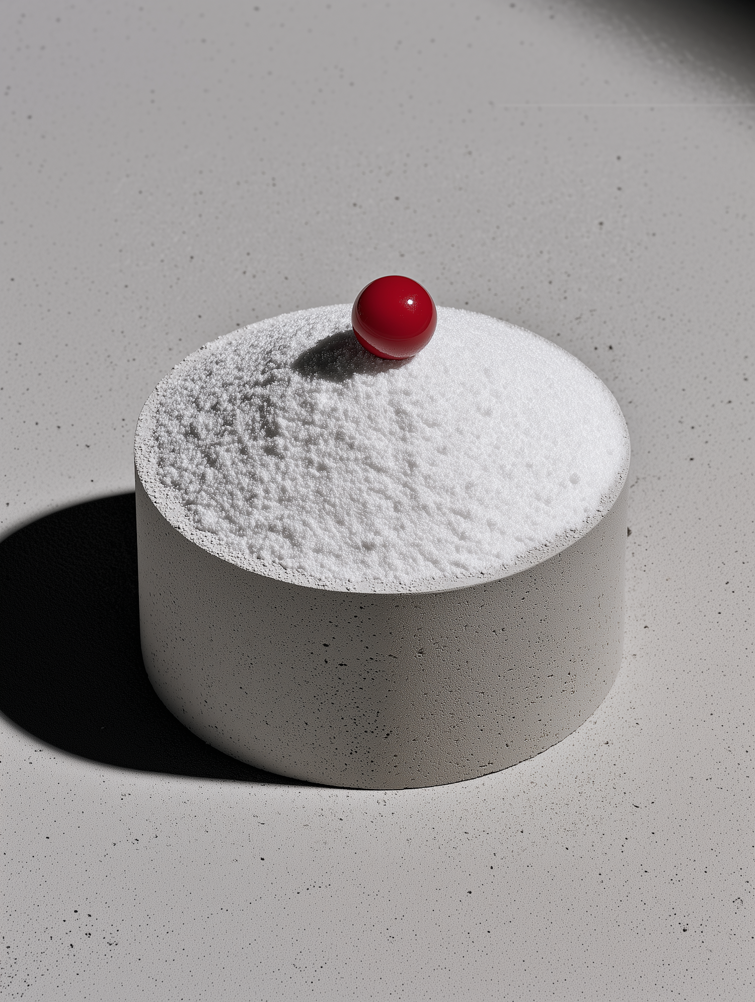 A minimalist composition featuring a red sphere atop a white powdered cylinder on a speckled gray surface.