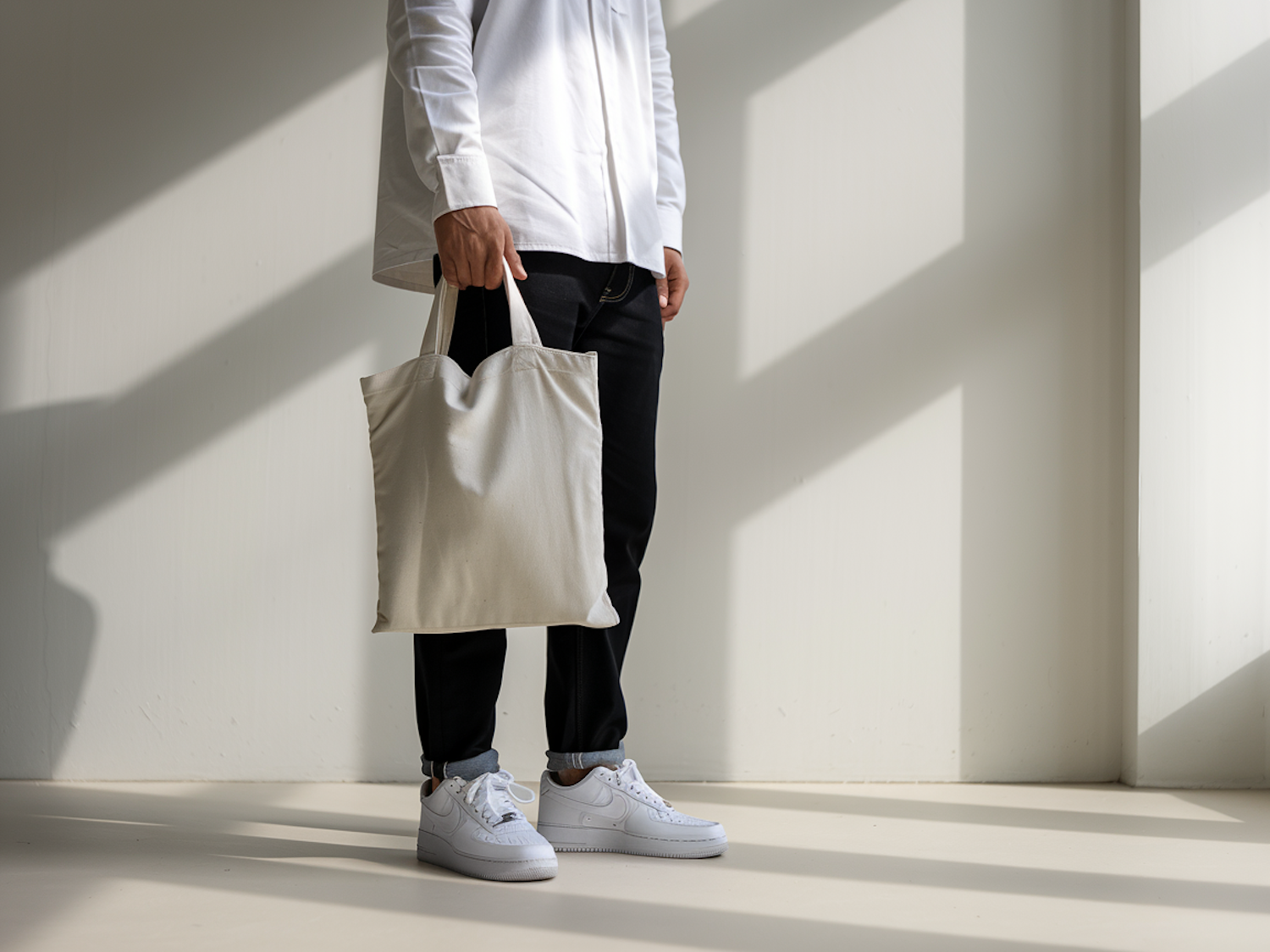 Minimalist style with a white shirt, black pants, and white sneakers, holding a beige tote bag in a sunlit modern space.