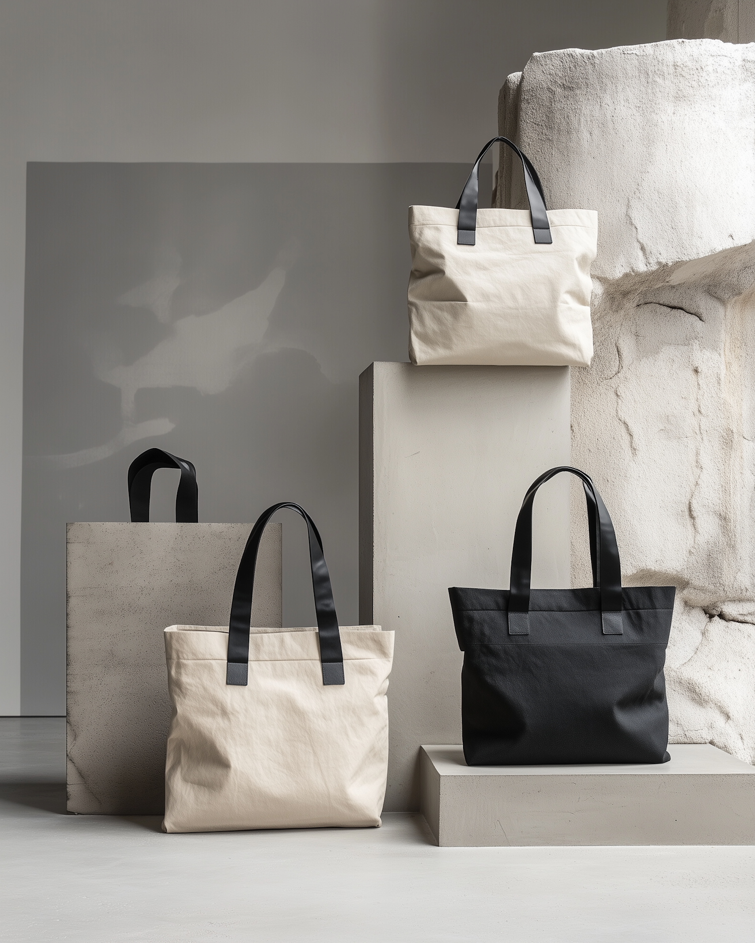 Minimalist tote bags in beige and black with sleek handles, displayed on geometric pedestals in a neutral, modern setting.