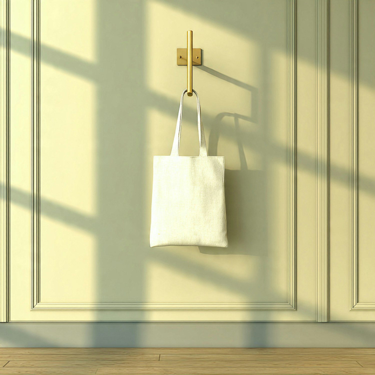 A white tote bag hangs on a golden hook against a beige paneled wall, with sunlight casting geometric shadows.