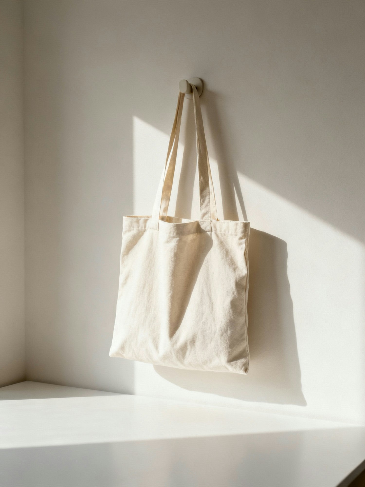 A beige canvas tote bag hangs on a white wall, bathed in soft natural light, creating a minimalistic and serene composition.