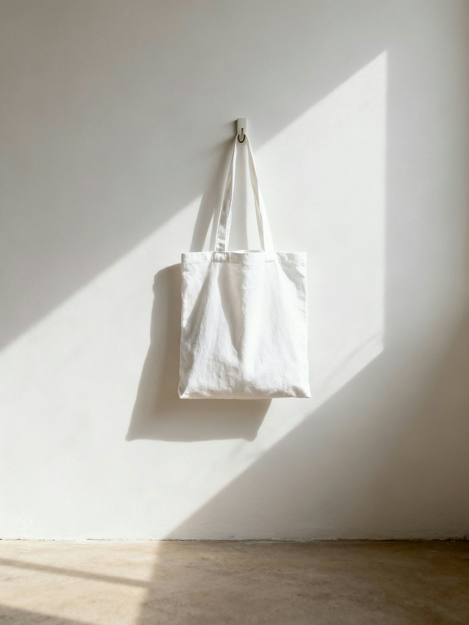 A white canvas tote bag hangs on a wall, bathed in natural sunlight, creating a minimalist and serene aesthetic.