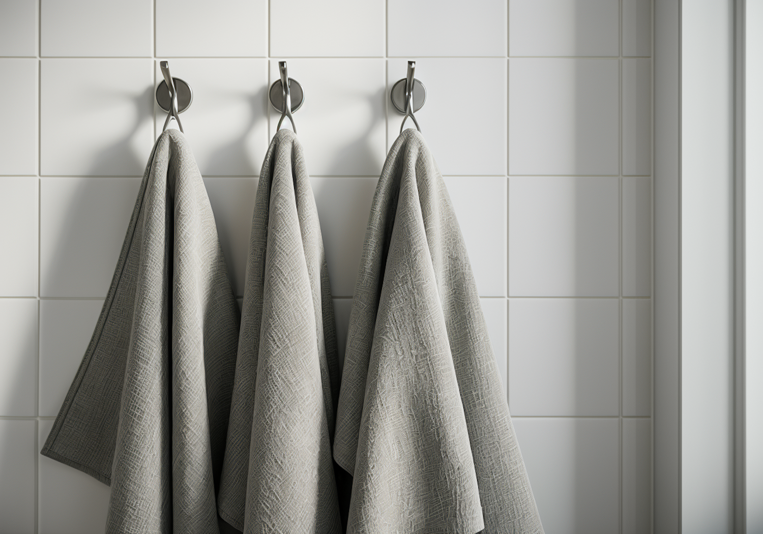 Three gray towels with a subtle pattern hang on hooks against a white tiled wall, creating a clean and minimalist bathroom aesthetic.