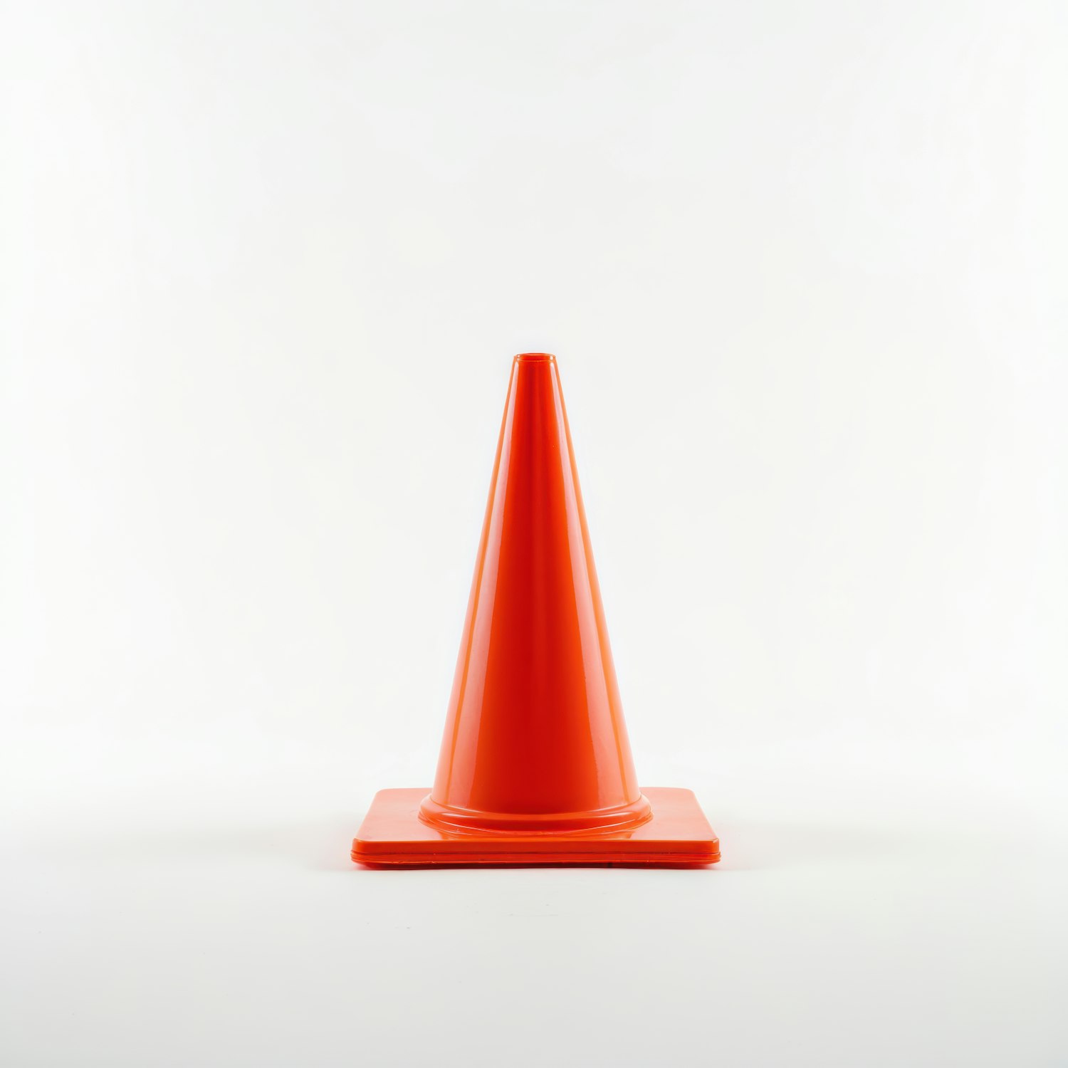 Bright orange traffic cone on a white background, highlighting its smooth, shiny surface and conical shape.
