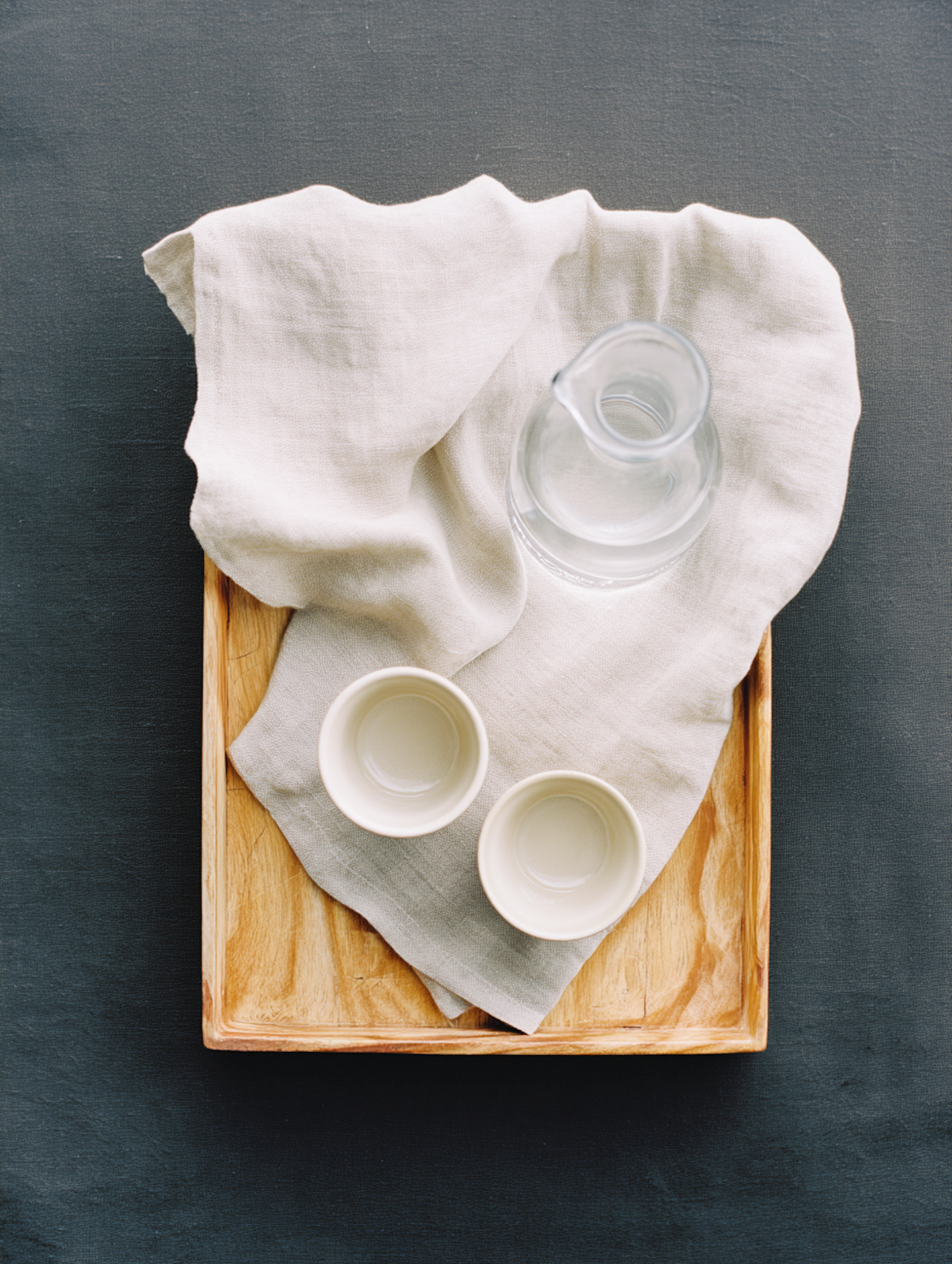 Minimalist wooden tray with a linen cloth, glass carafe, and two ceramic cups on a dark gray background.