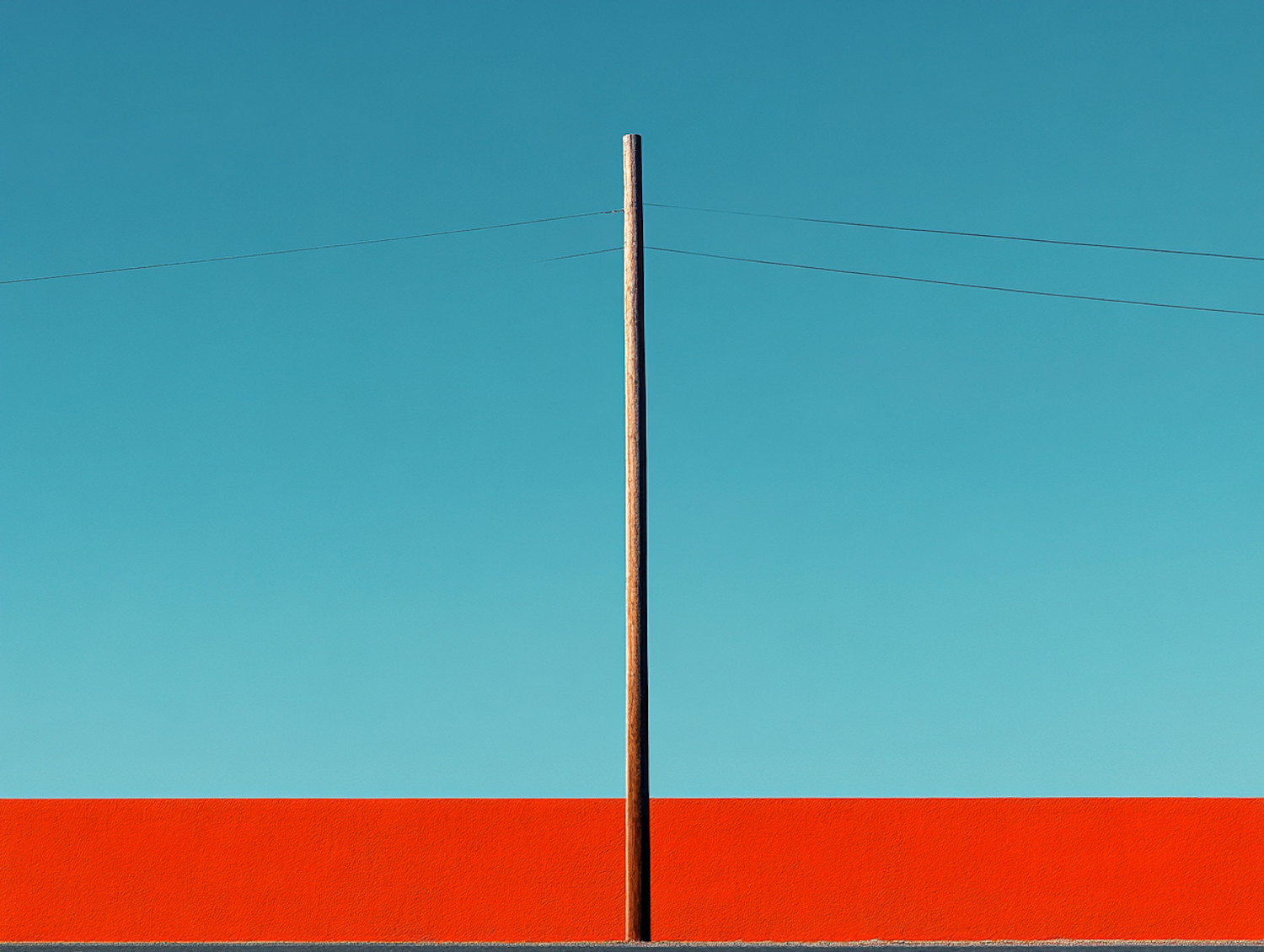 Minimalist scene with a wooden utility pole, vibrant orange wall, and clear blue sky, showcasing bold colors and geometric simplicity.
