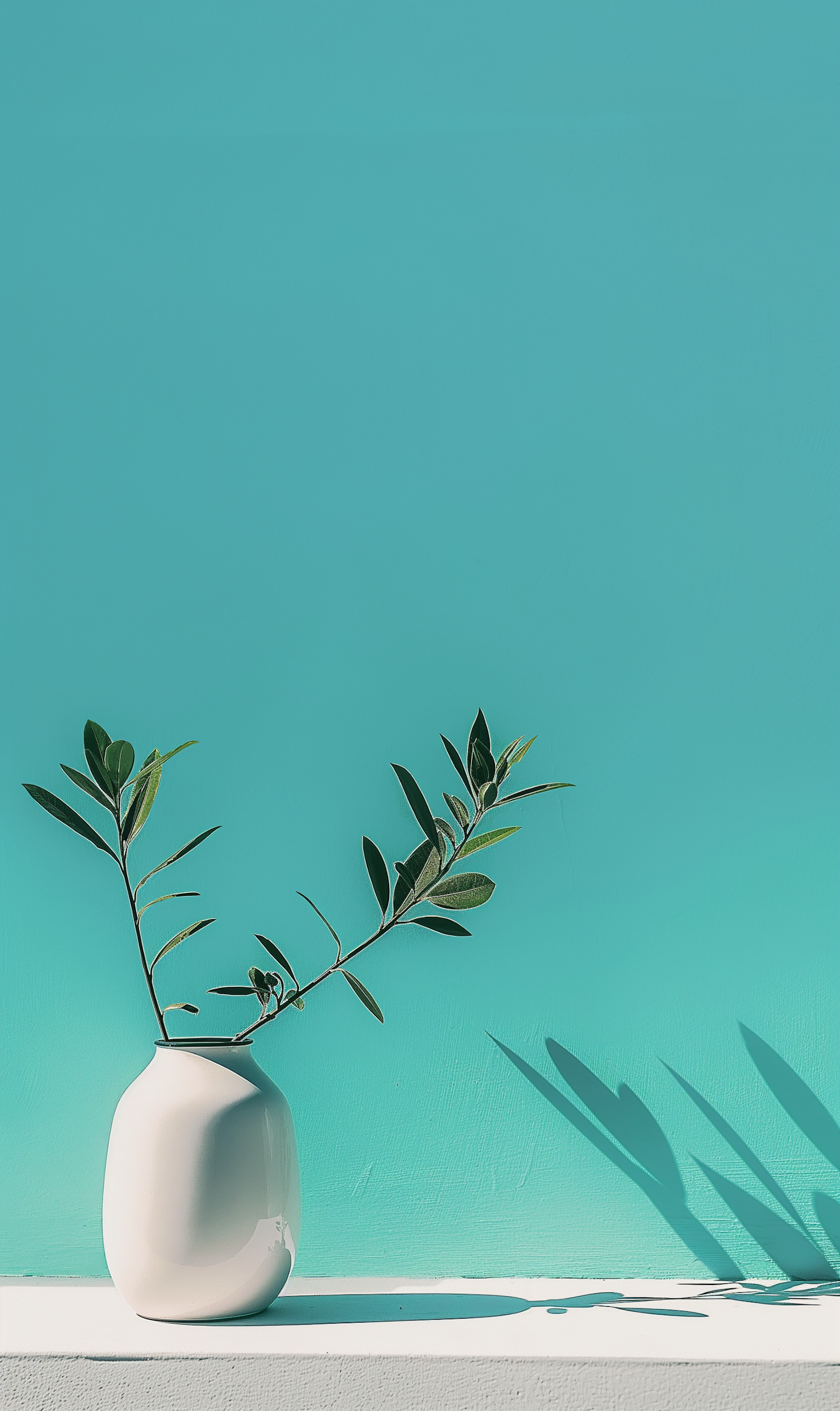 Minimalist white vase with green leaves against a turquoise background, casting elegant shadows. Bright and refreshing composition.