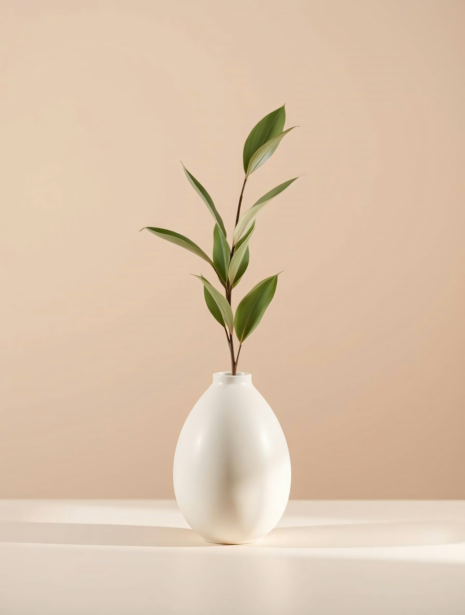 Minimalist white vase with green leaves on a beige background, perfect for modern decor inspiration or calming aesthetic vibes.