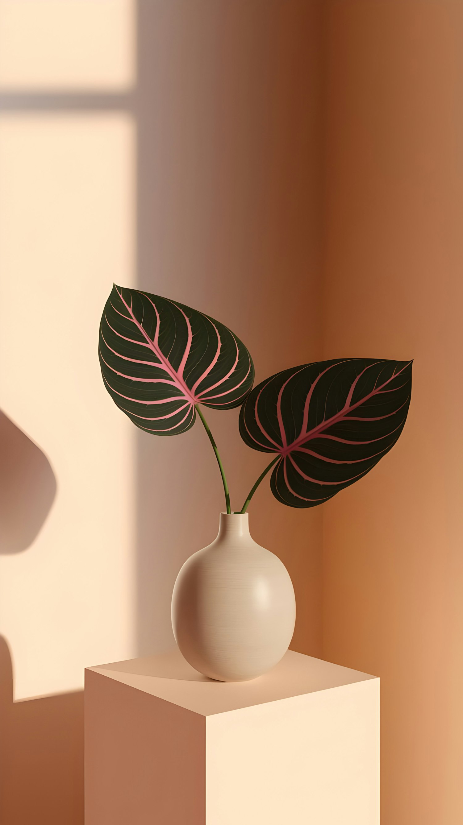 Minimalist decor with a beige vase holding dark green leaves with pink veins, set against a warm-toned background with soft shadows.