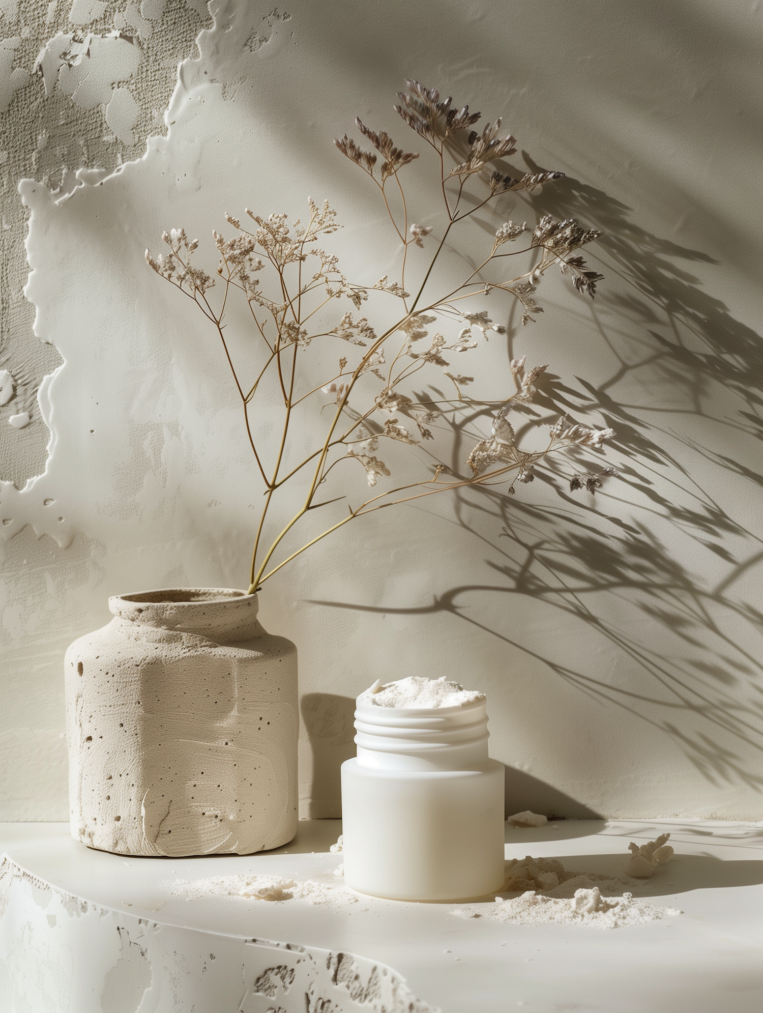 A minimal setup with a ceramic vase, delicate dried plants, and a white jar, accentuated by soft lighting and natural shadows.