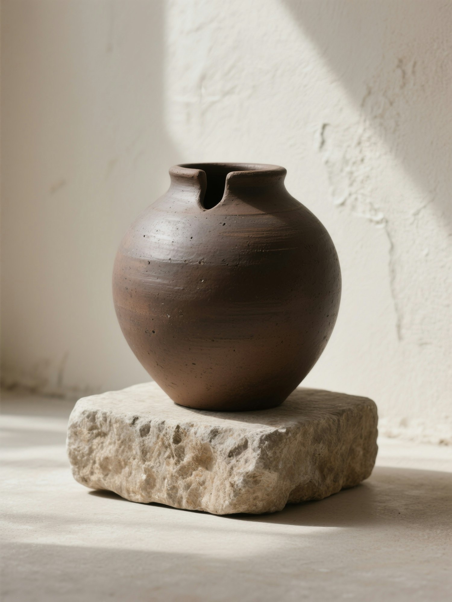 highly realistic photography, rustic handcrafted ceramics, natural daylight, soft shadows, minimal composition, textured clay surfaces, authentic artisanal atmosphere, calm and organic aesthetic, editorial product photography style. A rounded handcrafted clay pot with a narrow opening, finished in dark earthy brown with subtle matte patina, placed on the stone pedestal, neutral plaster wall backdrop.