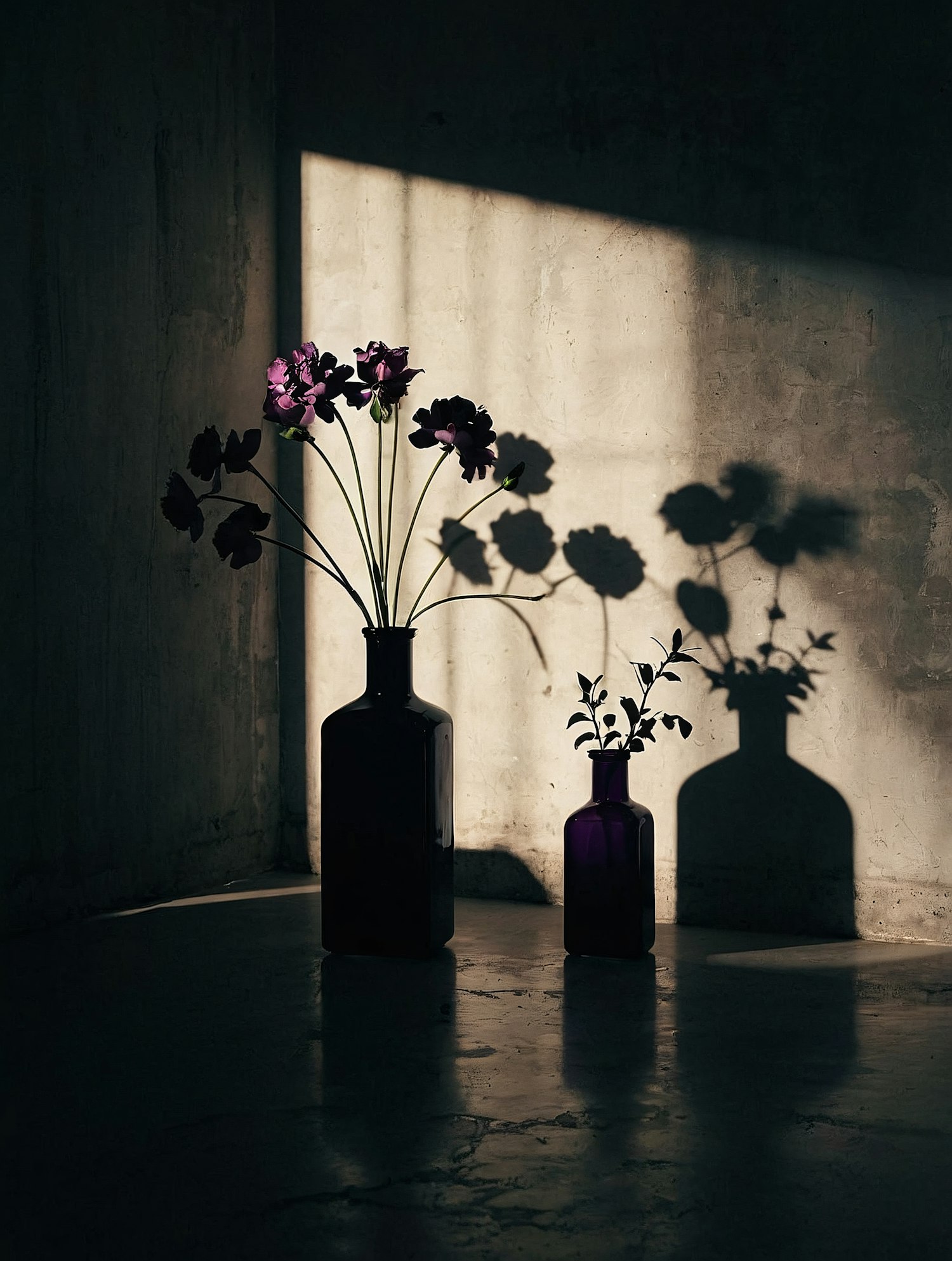 Minimalist still life with purple glass vases, flowers, and greenery casting dramatic shadows on a textured wall in warm sunlight.