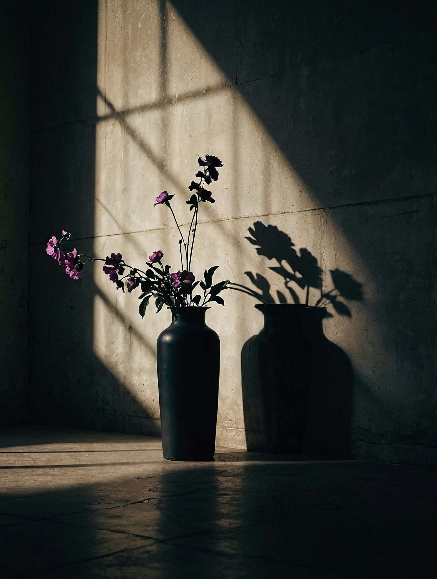 A black vase with purple flowers in sunlight, casting dramatic shadows on a concrete wall for a minimalist, artistic vibe.