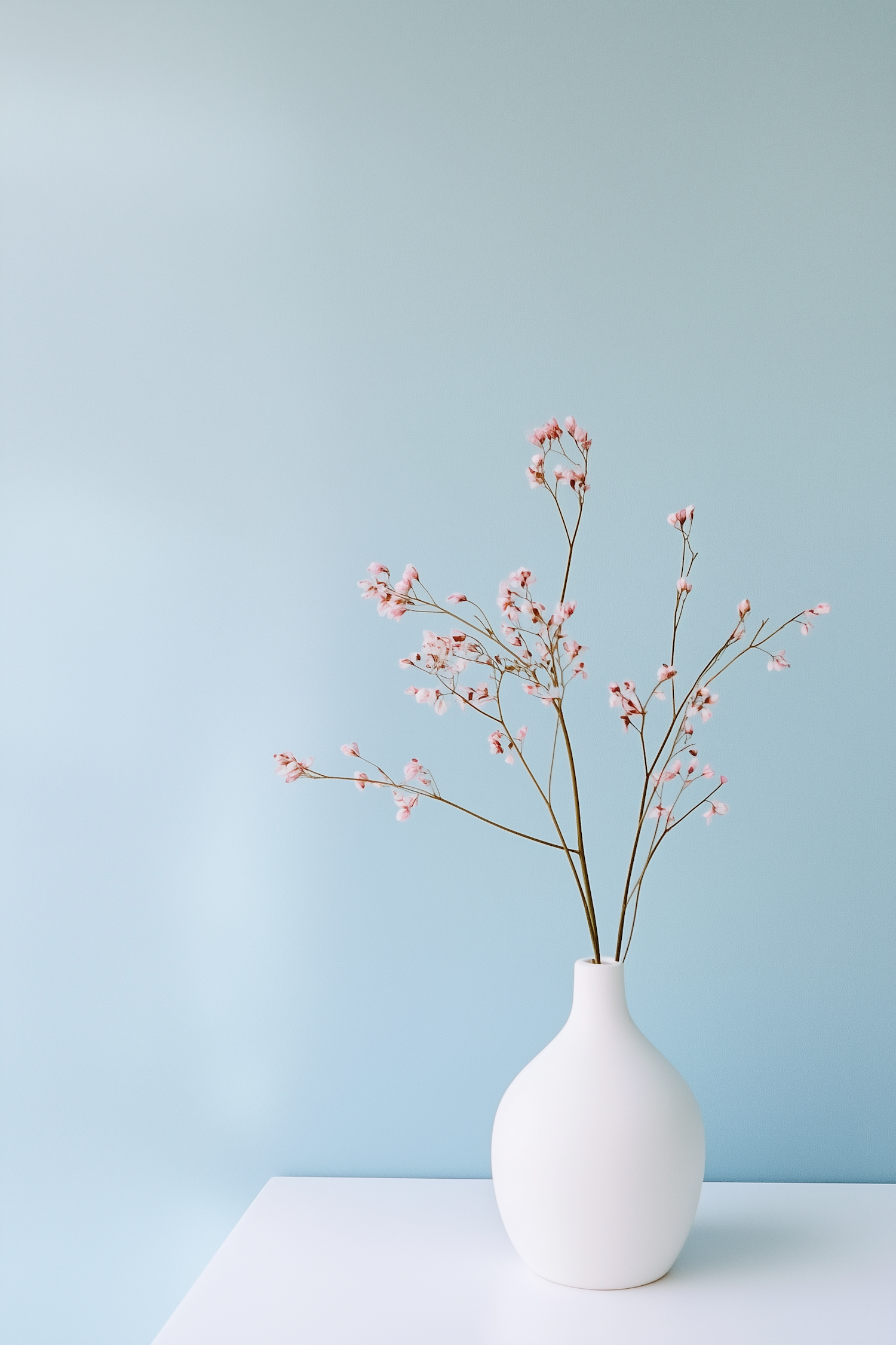 Minimalist white vase with delicate pink flowers on a white surface, set against a soft blue background for a serene aesthetic.